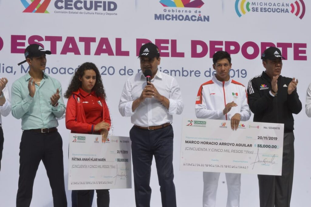 Sara Pulido / La Voz de Michoacán Morelia, Michoacán. El día de hoy se entregó el Premio Estatal del Deporte 2019 a la pedalista zitacuarense Fátima Híjar Marín y el taekwondoín moreliano Marco Horacio Arroyo Aguilar, en ceremonia realizada al término del Desfile Cívico Deportivo en conmemoración del 109 aniversario del inicio de la Revolución Mexicana. Ambos atletas se harán acreedores a un estímulo de 55 mil pesos en efectivo para cada uno. Marco Arroyo logró bronce en los pasados Juegos Panamericanos de Lima 2019 en poomsae individual; además de tercer lugar por parejas freestyle en el Campeonato Mundial 2018 de China; fue primer lugar en el clasificatorio a Juegos Panamericanos realizado en República Dominicana y plata en pareja mixta dentro del Primer Grand Prix de Poomsae, de Roma, Italia. Obtuvo dos oros en el Open Santos Domingo, de República Dominicana en individual y pareja freestyle. En Olimpiada y Nacional Juvenil 2019, se colgó plata en individual freestyle, además de bronce en individual y pareja mixta. Por su parte, la ciclista de montaña Fátima Híjar fue la única michoacana que participó en los Juegos Olímpicos de la Juventud 2018 celebrados en Argentina, en donde finalizó en la décimo tercera posición. Logró oro en el Campeonato Panamericano de ciclismo de Montaña dentro de la categoría Sub- 23, además de otro primer lugar en el Campeonato Mundial de la disciplina, celebrado en Canadá. Es la mejor del país, en su categoría, al obtener oro en el Campeonato Nacional realizado el pasado mes de agosto.