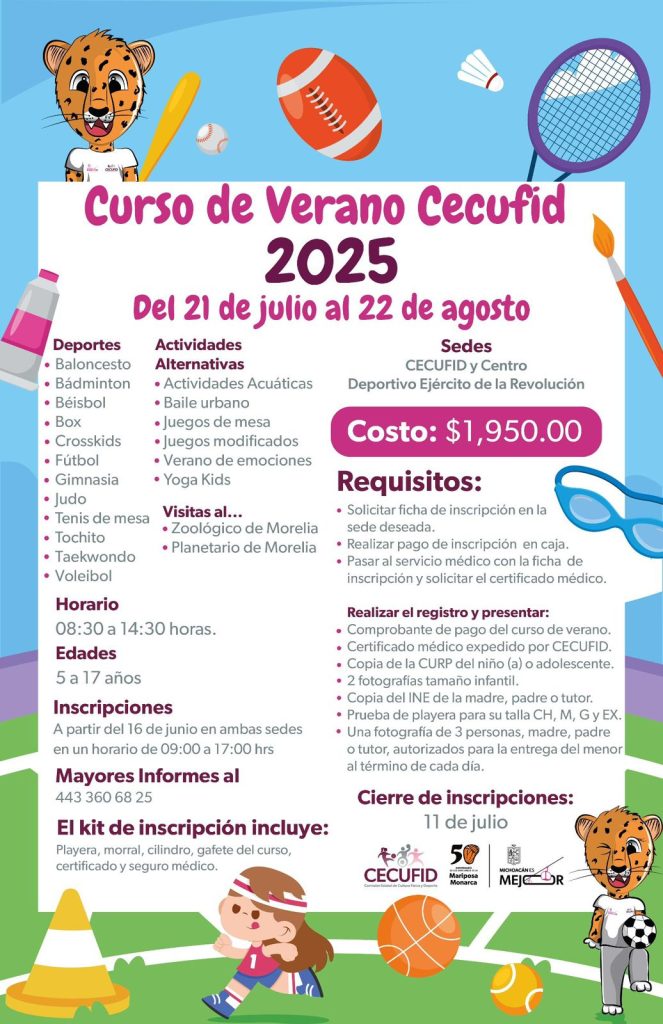 Morelia, Michoacán. - La Comisión Estatal de Cultura Física y Deporte (Cecufid) informa que las inscripciones para sus Cursos de Verano y de Natación 2025 ya están abiertas. Podrán registrarte hasta el 11 de julio para participar en las actividades que se realizarán en las instalaciones del Centro Deportivo Ejército de la Revolución (CDER) y Molino de Parras.