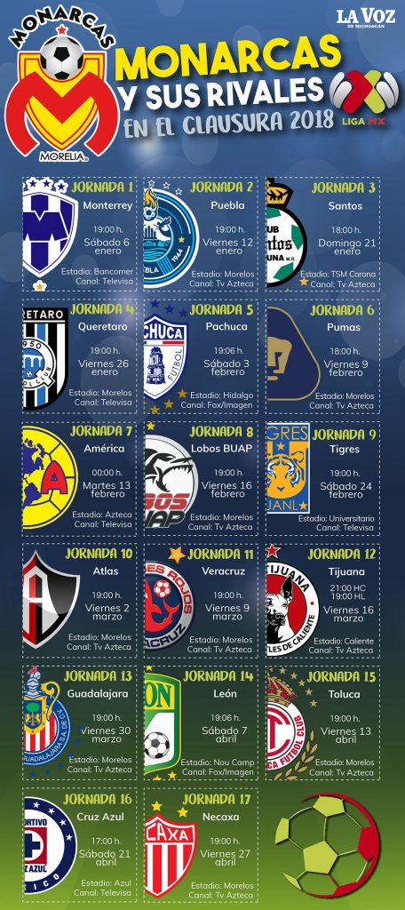 Notimex/La Voz de Michoacán. Morelia, Michoacán. Monarcas Morelia enfrentará a Puebla, Juárez y Celaya, estos dos últimos de la Liga de Ascenso, en la etapa de preparación hacia el Torneo Clausura 2018, informó la directiva. En la confección del plan de preparación, los rojiamarillos realizarán el trabajo físico a doble sesión a veces en Avándaro, Estado de México, del 17 al 23 de este mes. La primera prueba de futbol en esta etapa será el 23 de diciembre en las instalaciones de la Federación Mexicana de Futbol, luego el 28 ante Juárez y el 30 contra Celaya, esto dos últimos en una cancha anexa al Estadio Morelos. Monarcas Morelia, dirigido por Roberto Hernández, hará su debut en el Torneo Clausura 2018 el 6 de enero, en partido de visita a Rayados de Monterrey, actual subcampeón. Aquí te dejamos el calendario.