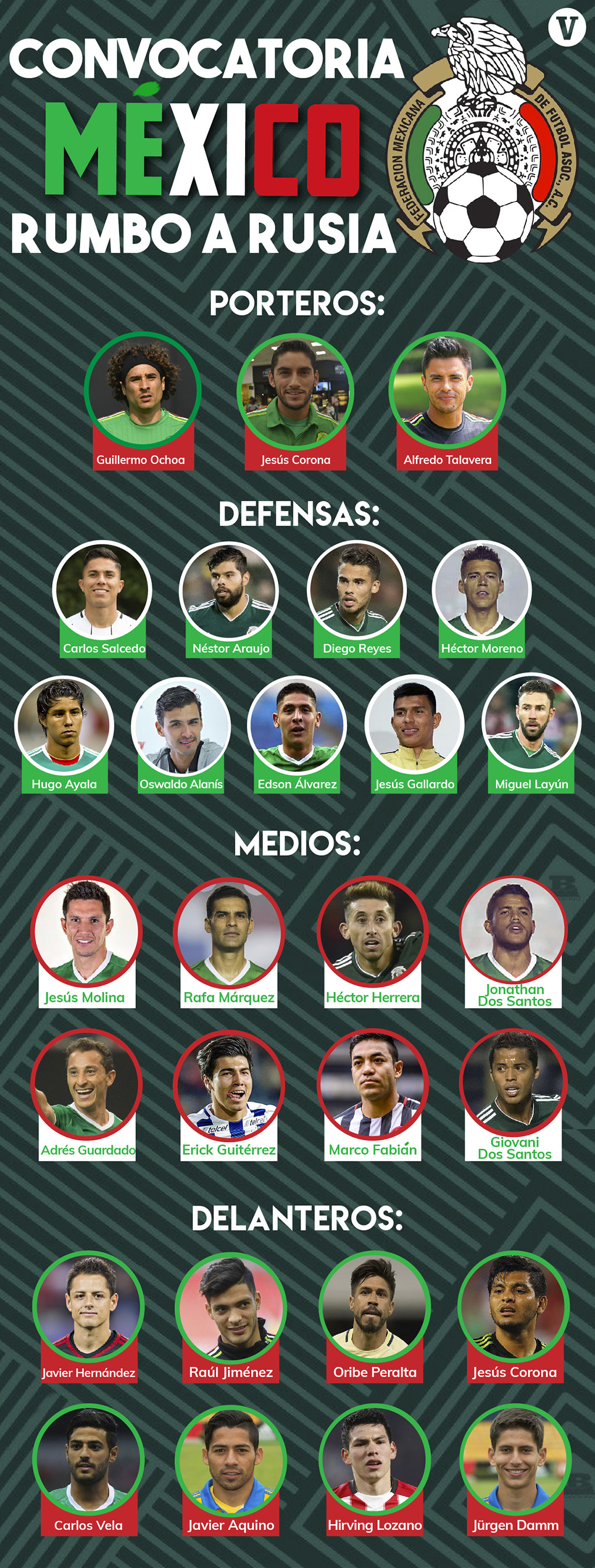 Redacción / La Voz de Michoacán Ciudad de México. Juan Carlos Osorio, entrenador de la Selección Mexicana, anunció una lista de 28 preseleccionados rumbo al Mundial de Rusia 2018. #HoyToca En el anuncio de la lista rumbo al Mundial de Rusia, Juan Carlos Osorio respondió a @CARLOSLGUERRERO los jugadores que se quedarían si el certamen iniciara mañana. ¡Imperdible! pic.twitter.com/Vt5LjYHBpr — Azteca Deportes (@AztecaDeportes) 14 de mayo de 2018 La lista está conformada por 3 porteros, 9 defensas, 8 medios y 8 atacantes: