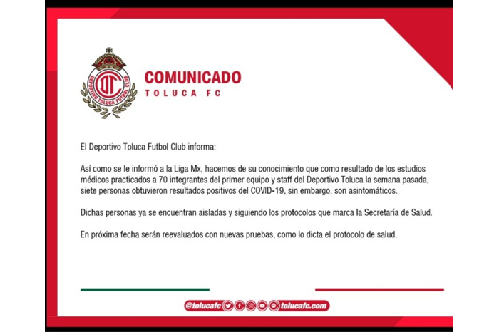 Agencias/La Voz de MichoacánToluca, Edomex. Siete integrantes del club mexicano de fútbol Toluca dieron positivo por Covid-19, sin presentar síntomas, informó la Liga MX, sin aclarar si son jugadores, personal del cuerpo técnico o del staff. “El club realizó 70 pruebas de detección de Covid-19 en los pasados días a jugadores, cuerpo técnico y staff del primer equipo. Siete personas obtuvieron resultados positivos, sin embargo, se trata de casos asintomáticos”, informó el organismo que rige las competencias de fútbol en México. Toluca es el séptimo equipo del fútbol mexicano que registra integrantes positivos de COVID-19. Santos Laguna, Pumas UNAM, León, Cruz Azul, Guadalajara y el vigente campeón Monterrey son los otros clubes que han registrado casos positivos. La Liga MX informó el 22 de mayo que el torneo Clausura, del que únicamente se disputaron 10 jornadas de 17, fue cancelado sin decretar un campeón. Se espera que en el transcurso de la semana se defina la fecha en que inicie el torneo Apertura. Al igual que otros clubes que han presentado esta situación, no revelaron la identidad de los contagiados con el objetivo de respetar integridad y derecho a la privacidad.