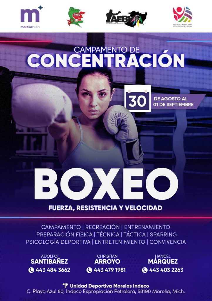 Redacción / La Voz de Michoacán Morelia, Michoacán.- Con el objetivo de descubrir nuevos talentos y ofrecer una formación integral en pugilismo, el Instituto Municipal de Cultura Física y Deporte (Imcufide) anuncia la realización de un Campamento de Concentración de Boxeo, que tendrá lugar del 30 de agosto al 01 de septiembre en la Unidad Deportiva Morelos Indeco. En coordinación con la Asociación Estatal de Boxeo de Michoacán, el Imcufide ha preparado este campamento, donde se impartirán conocimientos fundamentales en fuerza, resistencia y velocidad, esenciales para el boxeo. Durante estos tres días, los participantes recibirán formación especializada en entrenamiento físico y técnico, estrategia de combate, sparring, psicología deportiva, y actividades recreativas y de convivencia, todo esto bajo la guía de expertos en el deporte. Para más información sobre el proceso de inscripción, los interesados pueden comunicarse vía telefónica o enviar un mensaje de WhatsApp a los números 443 479 1981, 443 484 3662 y 443 403 2263.