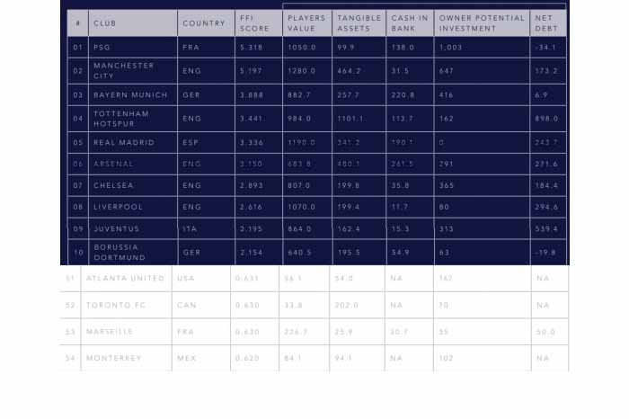 El Universal/La Voz de Michoacán.Paris Saint-Germain (PSG) es el club con mayor poder financiero en el fútbol mundial según el Soccerex Football Finance 100, el informe anual de los expertos en negocios de fútbol Soccerex, que utiliza una metodología a medida para evaluar y clasificar a los 100 mejores clubes del mundo según sus finanzas. El equipo mexicano mejor colocado es Rayados de Monterrey, que se encuentra en el lugar 54. Guadalajara está en el sitio 76 y el América en el 81. En la edición de 2020, el club parisino supera a Manchester City por primera vez en los tres años de historia del informe con un puntaje de 5.318 de Football Finance Index (FFI), que tiene en cuenta cinco variables financieras clave: activos de juego, activos tangibles, efectivo en efectivo. banco, inversión potencial del propietario y deuda neta. Manchester City, que ha superado todas las clasificaciones anteriores, fue segundo con un puntaje FFI de 5.197. Bayern Munich es tercero con una puntuación FFI de 3.888 en un top 10 que está dominado por los equipos de la Premier League con el Tottenham 4 º (3.441), Arsenal 6 º (3.150), Chelsea 7 º (2.893) y Liverpool 8 º (2.616). Real Madrid 5 ª (3.336), Juventus 9 º (2.195) y el Borussia Dortmund 10. Solo tres clubes mexicanos aparecen entre los primeros 100. Rayados, Chivas y América. En el continente americano, el LAFC, que tiene como principal estrella a Carlos Vela, de la Major League Soccer es el más poderoso, al ser colocado 18, seguido del LA Galaxy de Javier Hernández y Jonathan Dos Santos, en el 22.