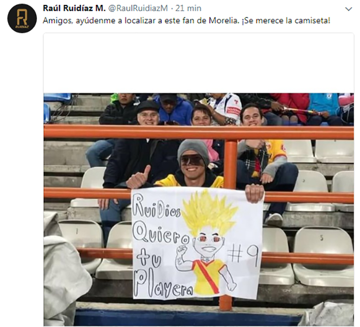 Fabian Alanís / La Voz de Michoacán Morelia, Michoacán. A través de su cuenta de Twitter, el jugador de Monarcas Morelia, Raúl Ruidiaz, compartió un mensaje para localizar a un fan que apoya al equipo y así regalarle un jersey. El peruano, quien marcó un gol el sábado pasado ante Pachuca, agradece el apoyo del joven, quien con una cartulina, con un dibujo del jugador, pide que le regale su playera.