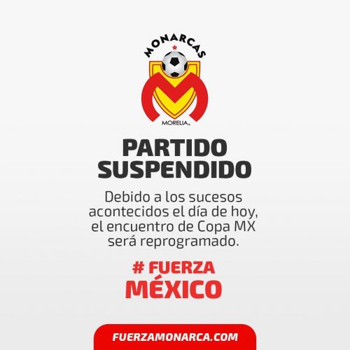 Sara Pulido/ La Voz de Michoacán Morelia, Michoacán. Fue suspendido el juego de Monarcas-Xolos, así como todos los de Octavos de Final de la Copa MX. Esto, tras el fuerte terremoto que cimbró México, principalmente el centro del país. En el caso del partido de Monarcas Morelia que estaba programado para las 19:00 horas de este martes, el equipo pidió a los que tenían su boleto que lo guarden, ya que más adelante se dará a conocer la mecánica para canjearlo por nuevo boleto. Se informó que más tarde se dará el reporte de la revisión del Estadio Morelos.
