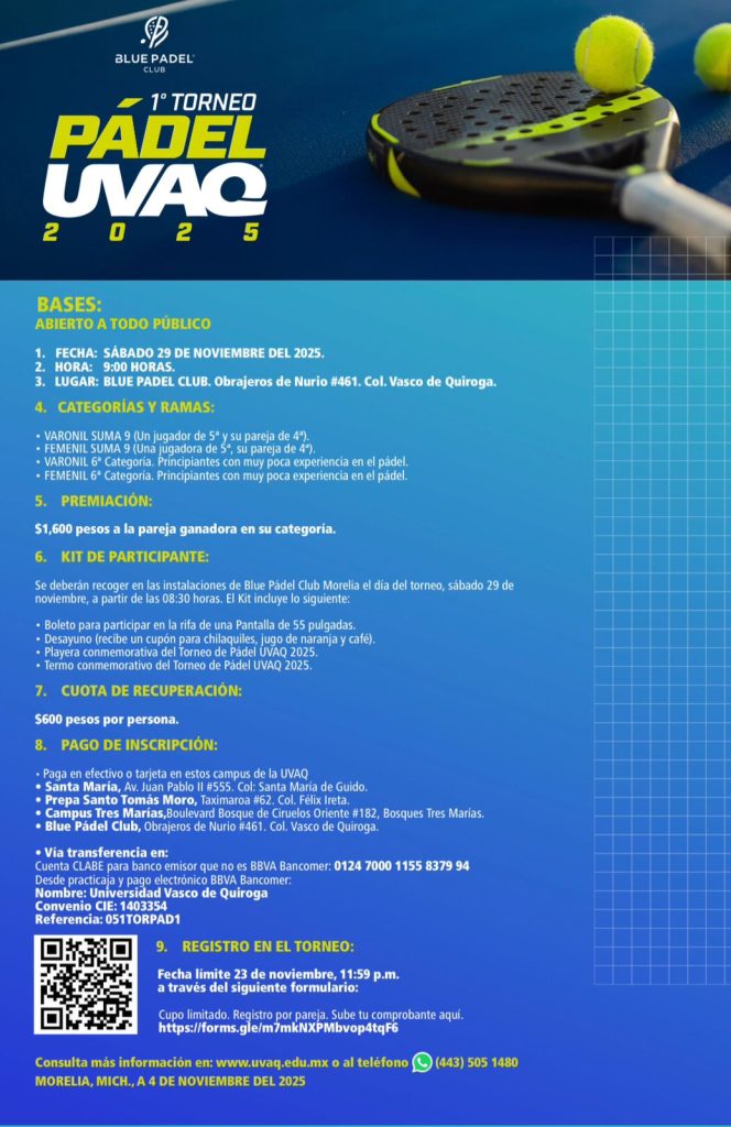 Ashley Rodríguez / La Voz de Michoacán Morelia, Michoacán. - La Universidad Vasco de Quiroga (UVAQ), anunció la realización de su Primer Torneo de Pádel 2025, que se llevará a cabo el 29 de noviembre a las 9:00 horas en el Blue Pádel Club, ubicado en Obrajeros de Nurio #461. Col. Vasco de Quiroga, en Morelia. La fecha límite de inscripción es el 23 de noviembre. El evento tendrá un costo de inscripción de 600 pesos por persona, garantizará 3 partidos por participante, contará con distintas categorías y ofrecerá kit conmemorativo, desayuno y boleto para la rifa de una pantalla de 55 pulgadas. De acuerdo con el Dr. Julio César Ruciles, Jefe del Depto. de Capacitación y Desarrollo en la UVAQ, el torneo busca fomentar los estilos de vida saludables, promover la actividad física y crear un espacio de convivencia entre estudiantes, egresados y público en general. Inscripciones abiertas Aunque el torneo es organizado por la UVAQ, la convocatoria es abierta al público en general. Las inscripciones pueden realizarse en línea o en los siguientes puntos físicos: Santa María: Av. Juan Pablo II #555. Col. Santa María de Guido. Prepa Santo Tomás Moro: Taximaroa #62. Col. Félix Ireta. Campus Tres Marías: Boulevard Bosque de Ciruelos Oriente #182, Bosques Tres Marías. Blue Pádel Club: Obrajeros de Nurio #461. Col. Vasco de Quiroga. Entre los métodos de pago destacan el efectivo y tarjeta; asimismo se puede realizar transferencia bancaria, cuyos datos y formulario de registro se encuentran en la convocatoria oficial del torneo. Kit de participante y premiación Julio Ruciles explicó que la inscripción incluye el kit de participante, que se deberá recoger en las instalaciones de Blue Pádel Club Morelia el día del torneo, a partir de las 8:30 horas. El kit incluye: Boleto para participar en la rifa de una pantalla de 55 pulgadas. Desayuno (recibe un cupón para chilaquiles, jugo de naranja y café). Playera conmemorativa del Torneo de Pádel UVAQ 2025. Termo conmemorativo. “El simple hecho de inscribirse ya permite acceder a este kit y a la rifa, además de garantizar tres juegos, porque no buscamos un torneo exclusivamente competitivo, sino una dinámica de convivencia”, destacó Julio. En cuanto a la premiación se otorgarán mil 600 pesos a la pareja ganadora en su categoría. Categorías y dinámica del torneo El evento está diseñado para incentivar la participación de personas con distintos niveles de experiencia. Por ello, se contemplan: Varonil suma 9 (Un jugador de 5a y su pareja de 4a). Femenil suma 9 (Una jugadora de 5a, su pareja de 4a). Varonil 6a Categoría: Principiantes con muy poca experiencia en el pádel. Femenil 6a Categoría: Principiantes con muy poca experiencia en el pádel. Julio destacó que el pádel es un deporte “noble con las articulaciones”, adecuado para niñas, niños, jóvenes y adultos mayores. Los menores de edad podrán participar siempre que un padre o tutor firme la autorización correspondiente. La popularidad del pádel en Morelia también influyó en la organización del evento. “Hoy hay una cancha muy cerca de cualquier punto de la ciudad y es un deporte que ha crecido muchísimo. Queremos aprovecharlo para impulsar estilos de vida saludables”. Invitación abierta El Dr. Julio invitó a la ciudadanía a unirse al Primer Torneo de Pádel UVAQ 2025 y aprovechar esta oportunidad para convivir, ejercitarse y vivir un ambiente positivo. Asimismo, compartió un mensaje final sobre la importancia de mantenerse activos y cuidar la salud integral: “Recordar que la vida es movimiento. Hoy más que nunca los jóvenes están poniendo atención a su salud y al cuidado de su cuerpo; qué mejor que hacerlo a través del deporte”, concluyó. Consulta más información en: www.uvaq.edu.mx o al teléfono (443) 505 1480