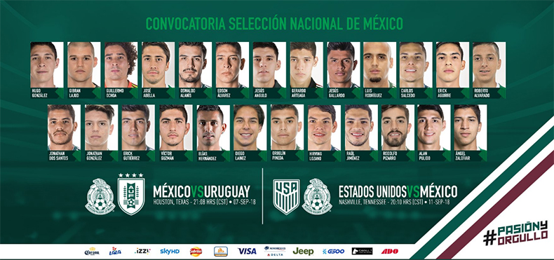 Redacción / La Voz de Michoacán Ciudad de México. La Dirección de Selecciones Nacionales da a conocer la lista de jugadores convocados por el Director Técnico Interino de la Selección Nacional de México, Ricardo Ferretti para los partidos de la próxima Fecha FIFA ante Uruguay y Estados Unidos de los días 7 y 11 de septiembre, en Houston y Nashville, respectivamente. La concentración dará inicio el domingo 2 de septiembre a las 19:30 hrs. en el Centro de Alto Rendimiento de la Federación Mexicana de Fútbol, donde trabajarán hasta el próximo jueves 6, día que se realizará el viaje a Houston, Texas. El sábado 8 de septiembre, el Tricolor se trasladará a Nashville, para enfrentar al equipo de las barras y las estrellas. Porteros Guillermo Ochoa – Standard Lieja Hugo González – Necaxa Gibran Lajud – Tijuana Defensas Carlos Salcedo – Eintracht Frankfurt Oswaldo Alanís – Real Oviedo Edson Álvarez – América Jesús Gallardo – Monterrey José Abella – Santos Luis Rodríguez – Tigres Jesús Angulo – Santos Gerardo Arteaga – Santos Medios Jonathan Dos Santos – L.A. Galaxy Roberto Alvarado – Cruz Azul Diego Lainez – América Jonathan González – Monterrey Orbelín Pineda – Guadalajara Víctor Guzmán – Pachuca Erick Aguirre – Pachuca Erick Gutiérrez – Pachuca Elías Hernández – Cruz Azul Delanteros Rodolfo Pizarro – Monterrey Hirving Lozano – PSV Eindhoven Raúl Jiménez – Wolverhampton Angel Zaldívar – Guadalajara Alan Pulido – Guadalajara Partidos México vs. Uruguay Viernes 7 de septiembre, 2018 21:00 hrs. NRG Stadium; Houston, Texas Estados Unidos vs. México Martes 11 de septiembre, 2018 20:00 hrs. Nissan Stadium; Nashville, Tennessee Comunicación