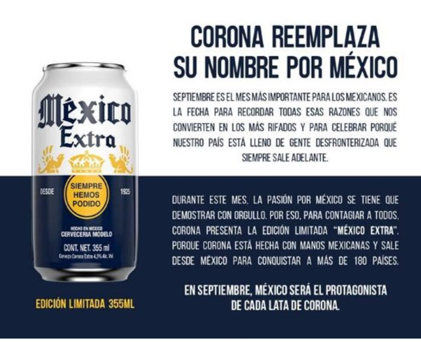Ariadna Báez/La Voz de Michoacán Morelia, Michoacán. La tradicional "Corona Extra" cambia su nombre por "México Extra", como un homenaje "a la tierra que la vio nacer, la impulsó a crecer y la llevó a romper fronteras", señala la empresa. La edición limitada “México Extra” estará disponible hasta agotar existencias y sin costo extra, celebrando durante el mes de septiembre. Así luce la nueva imagen: El anuncio lo dio el CEO de la compañía, Mauricio Leyva, como parte de la campaña "Bieninchismo". “Queremos que sea un entendido como un homenaje al país y no al oportunismo, así que estamos teniendo mucho cuidado”, dijo Alex Pinto, director de marca Corona en México. https://www.youtube.com/watch?v=wrACeV29PS0 La idea está relacionada con la campaña “Desfronterízate” y se inspira de Corona, ya que sus cervezas, se consumen en más de 180 países; están hechas en México por manos mexicanas.