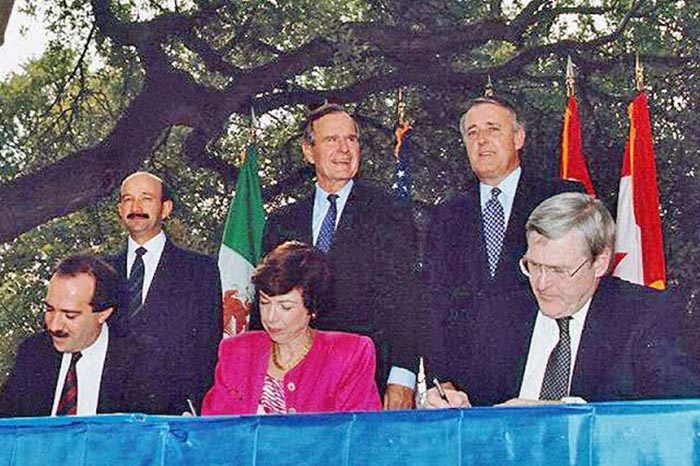 El pacto es el reemplazo de Trump al Tratado de Libre Comercio de América del Norte (TLCAN), que entró en vigor en 1994. El TLCAN redujo los aranceles y eliminó la mayoría de las barreras comerciales entre México, Estados Unidos y Canadá, abriendo la puerta a una oleada comercial entre los tres países.