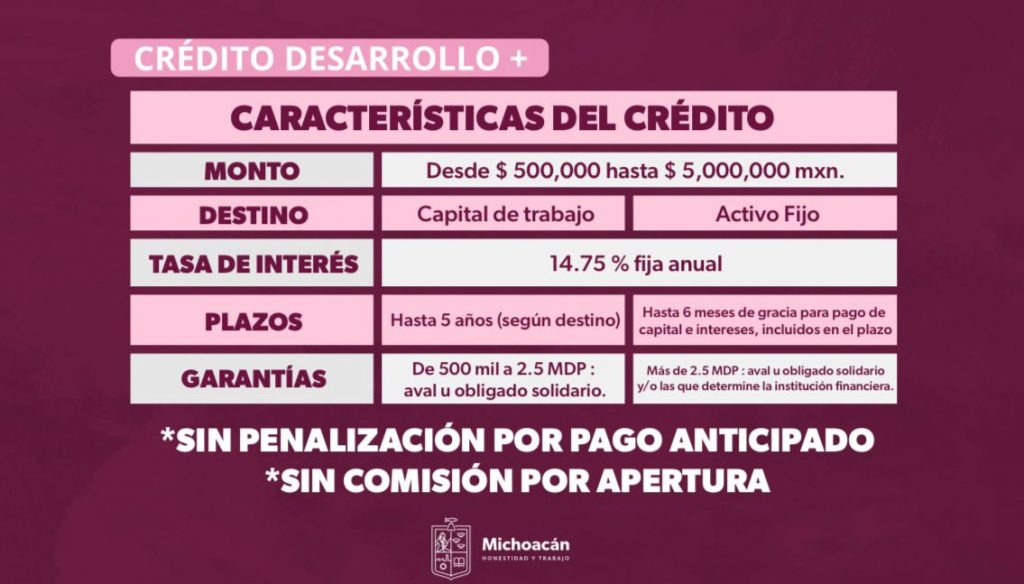 Redacción / La Voz de Michoacán Morelia, Michoacán. El crédito bien empleado consolida empresas, afirmó el titular de la Secretaría de Desarrollo Económico (Sedeco), Claudio Méndez Fernández, por lo que invitó a los empresarios michoacanos a acceder al programa de financiamiento Desarrollo+ Nuestra Mejor Versión hasta por 5 millones de pesos. Recordó que el programa opera con aportación económica de Sedeco y el Sistema Integral de Financiamiento para el Desarrollo de Michoacán (Sí Financia), y además es potenciado por Nacional Financiera (Nafin), el cual llegó a una bolsa de cerca de 250 millones de pesos. En este sentido, explicó que se tiene el objetivo de colocar 170 créditos aproximadamente con tasas preferenciales de 14.75 por ciento anual, para consolidar las empresas michoacanas frente al nearshoring, como proveeduría local. Los interesados en este beneficio pueden acudir al módulo de atención en las instalaciones de Espacio Emprendedor (EE), ubicadas en General Lázaro Cárdenas #1700, colonia Chapultepec Norte, en Morelia, en donde se presentará la solicitud del crédito. Además, se puede solicitar más información al teléfono 4431134500, extensión 58260 o al correo, sedeco.induimpulsa@gmail.com.