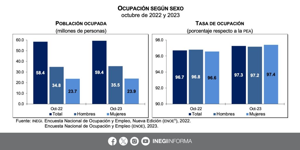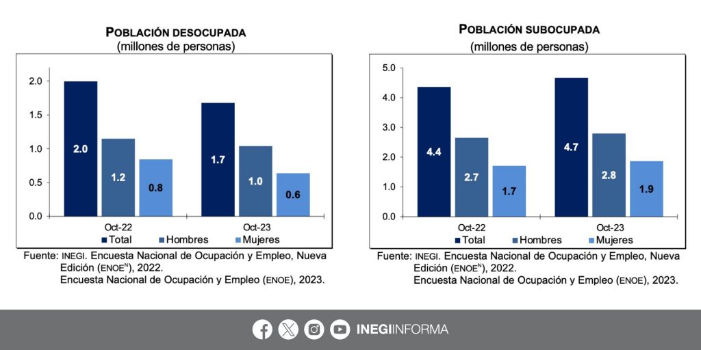 EFE / La Voz de Michoacán Ciudad de México.- La tasa de desempleo en México descendió en octubre pasado al 2.7% de la población económicamente activa (PEA), informó este jueves el Instituto Nacional de Estadística y Geografía (Inegi). El dato es menor al índice del 3.3% del mismo mes de 2022 y al de 2.9% de septiembre pasado, precisó el organismo autónomo en su reporte. "La población desocupada fue de 1.7 millones de personas y la tasa de desocupación (TD), de 2.7% de la PEA. Respecto a octubre de 2022, la población desocupada descendió en 316 mil personas y la TD fue menor en 0.6 puntos porcentuales", detalló el Inegi. La PEA del décimo mes del año llegó a 61.1 millones de personas de 15 años y más, lo que representó una tasa de participación de 60.5% y una población activa superior en 676 mil personas a la de octubre de 2022. De la PEA, 59.4 millones de personas estuvieron ocupadas durante octubre, 1 millón más que en el mismo mes de un año antes. Las personas subocupadas, es decir, quienes declararon tener necesidad y disponibilidad para trabajar más horas, fueron 4.7 millones, el 7.9% de la población ocupada, un incremento de 309 mil personas ante octubre de 2022. https://www.inegi.org.mx/contenidos/saladeprensa/boletines/2023/enoen/enoen2023_11.pdf Por sectores e informalidad Los trabajadores informales en octubre totalizaron 32.9 millones, lo que mantuvo la tasa de informalidad en 55.4%. La población ocupada por sector de actividad se distribuyó con 43.9% del total en servicios, en comercio 19.8%, en manufacturas el 15.6%, en actividades agropecuarias 11.3 % y en construcción 8.1%. Mientras que en "otras actividades económicas", que incluyen minería, electricidad, agua y suministro de gas, estuvo ocupada el 0.7%, y otro 0.7% no especificó actividad. Por género, la PEA femenina en octubre fue de 24.5 millones y la masculina de 36.5 millones, con una tasa de participación de 45.8% en mujeres en edad de trabajar y de 77.1% en hombres. Las cifras de empleo reflejan el comportamiento de la economía de México, cuyo producto interior bruto (PIB) creció un 3.3% interanual y un 1.1% trimestral en el tercer trimestre de 2023, con lo que acumula un aumento de 3.4% en el año.