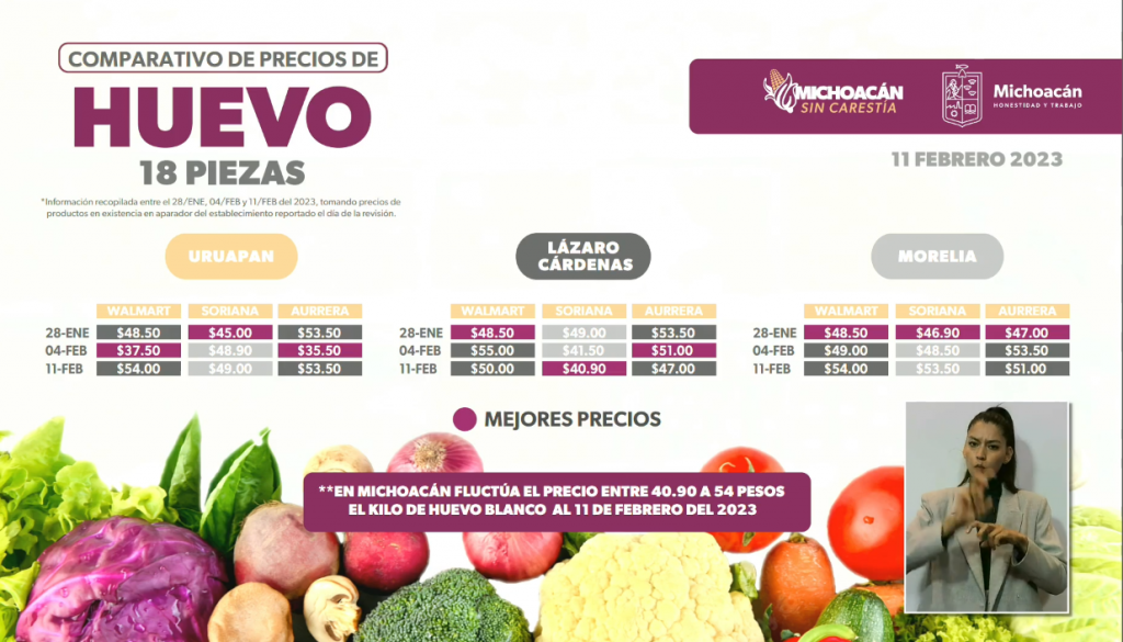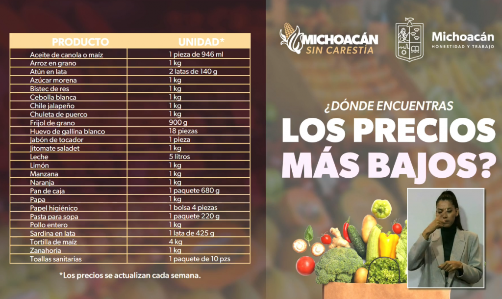 Redacción / La Voz de Michoacán Morelia, Michoacán. Los 25 productos de la canasta básica que compara la Secretaría de Desarrollo Económico de Michoacán (Sedeco) en Morelia se encuentra la más barata en el tianguis de la feria, a un precio de 1,070.50 pesos, en tanto que en tiendas Merza está más cara. De los establecimientos analizados en 6 municipios, Aurrera de Zitácuaro es donde se tiene el precio más económico, a $996.50.00, seguido de Soriana, Uruapan, a $999.40 PRECIOS EN MORELIA Tianguis de la Feria: $1,070.50Mercado San Juan: $1,101.00 PRECIOS EN URUAPAN Soriana: $999.40Walmart: $1,050.40 PRECIOS EN LÁZARO CÁRDENAS Soriana: $998.50Tiendas Neto: $1,019.50 PRECIOS EN APATZINGÁN Aurrera: $1,076.30Mercado Municipal: $1,120.50 PRECIOS EN ZAMORA Aurrera: $1,054.30Walmart: $1,066.00 PRECIOS EN ZITÁCUARO Aurrera: $996.50Mercado Municipal: $114.00