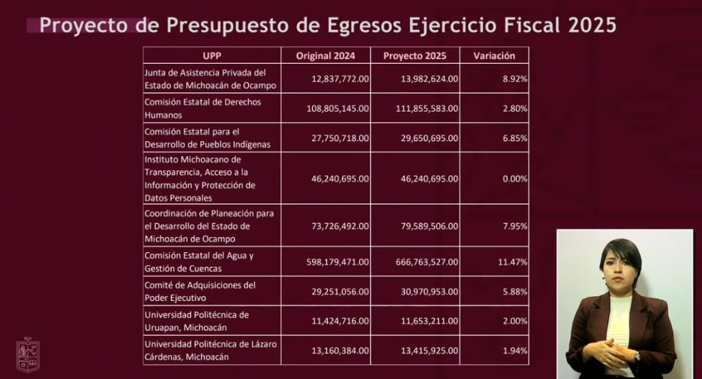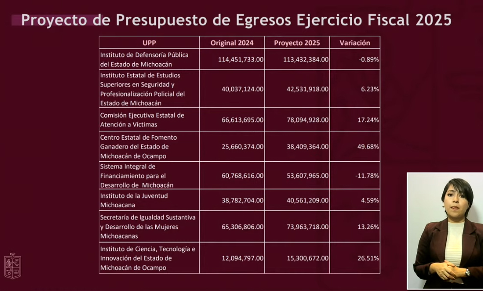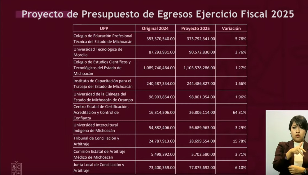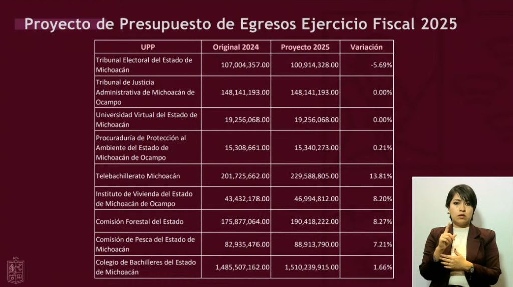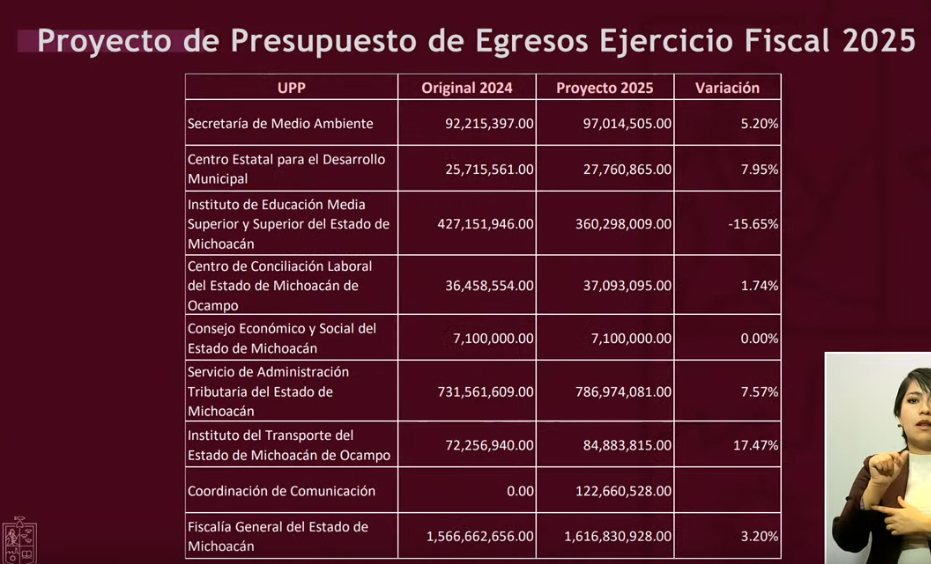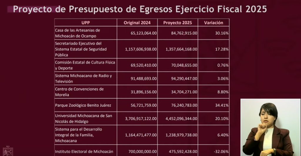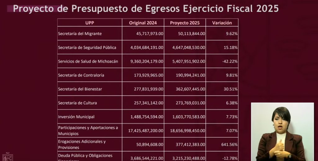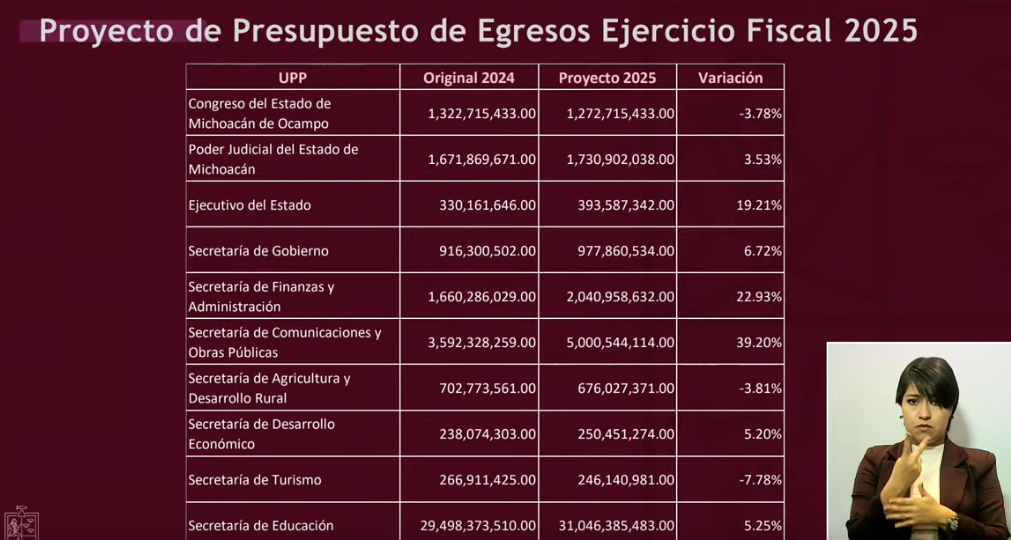 Redacción / La Voz de Michoacán Morelia, Michoacán. Sin déficit, sin deuda, sin nuevos impuestos; realista, austero y detonante en inversión, así como mayor apoyo a los municipios, a educación, infraestructura, seguridad y bienestar, destacó el secretario de Finanzas del Gobierno de Michoacán, Luis Navarro García, sobre el Presupuesto de Egresos que se tiene proyectado para 2025. En el desglose que hizo este viernes Navarro García obre el gasto estatal del próximo año, destaca la reducción de -42.22% en el rubro de Servicios de Salud de Michoacán, mientras que entre los registran incremento se encuentran Seguridad Pública, Obras Públicas, Bienestar, Universidad Michoacana de San Nicolás de Hidalgo (UMSNH), Finanzas, incluso el Zoológico de Morelia. El secretario de Finanzas destacó que en total, el Presupuesto de Egresos 2025 asciende a 98 mil 933 millones 474 mil 315 pesos, destacando también un aumento en participaciones federales, que en 2025 se proyectan 42 mil 519 millones 322 mil 631 pesos, así como Transferencias Federales por Convenio, de 4 mil 782 millones 926 mil 881 pesos, y en Incentivos derivados de la Coordinación Fiscal, de 516 millones 790 mil 602 pesos. Asimismo, se destina un menor monto al pago de deuda a largo plazo, de 3 mil 686 millones 544 mil 221 pesos a 3 mil 215 millones 230 mil 48 pesos, una reducción equivalente a -12.78%. Luis Navarro resaltó que los ingresos de fuentes locales también registran incremento, de 6 mil 318 millones 654 mil 452 pesos en 2024 a 8 mil 495 millones 949 mil 160 pesos en 2025. Respecto a las reducciones, en Servicios de Salud en Michoacán se contempla invertir 5 mil 407 millones 951 mil 902 pesos el próximo año, cuando en el previo se destinó un gasto de 9 mil 360 millones 2024 mil 179 pesos. En contraparte, el incremento para 2025 en Educación es de 5.25%, con 31 mil 46 millones 385 mil 483 pesos a ejercer; en Seguridad Pública 15.18% (4 mil 647 millones 48 mil 530 pesos); en Obras Públicas, de 39.20% (5 mil millones 544 mil 114 pesos); en Bienestar, de 30.51% (362 millones 607 mil 445 pesos); en la UMSNH de 20.10% (4 mil 452 millones 96 mil 344 pesos; y en el Zoológico de Morelia de 34.41% (76 millones 240 mil 783 pesos). DESGLOSE DEL PRESUPUESTO DE EGRESOS 2025