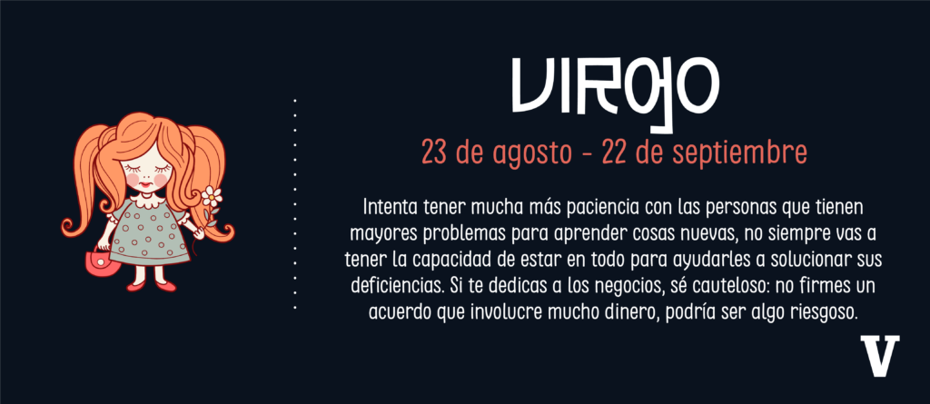 Horóscopos | 9 Sep, 2020, 10:20 Virgo: sé paciente y cauteloso; consulta los horóscopos y descubre lo que debes saber Hay virtudes que debemos cultivar conforme vamos avanzando en la vida: la paciencia y la cautela son dos de ellas. Imagen: La Voz de Michoacán. - + PUBLICIDAD