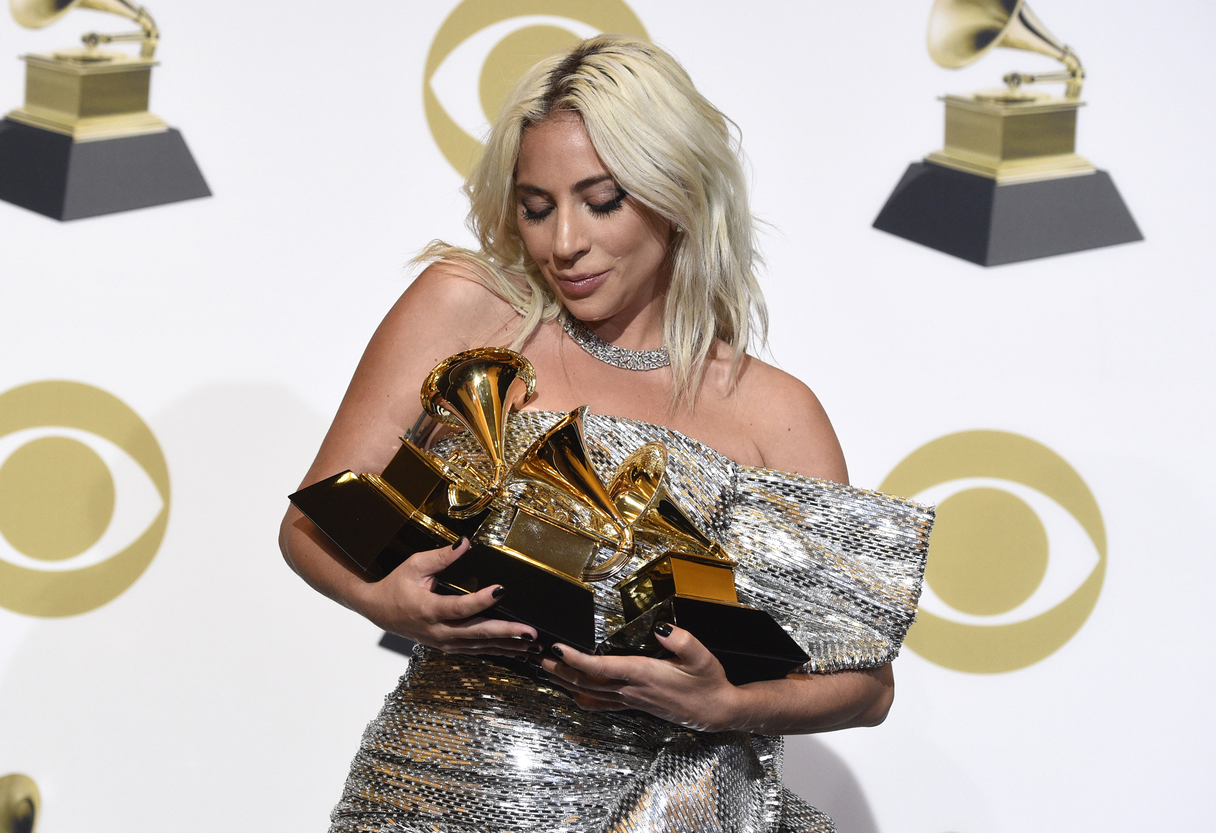 ARCHIVO – En esta fotografía de archivo del 10 de febrero de 2019 Lady Gaga en la sala de prensa con sus premio a mejor interpretación solista por "Joanne (Where Do You Think You're Goin'?)", mejor interpretación pop de un dúo o grupo y mejor canción para un medio visual por "Shallow" en la 61a entrega anual de los Grammy en Los Angeles. Aunque Lady Gaga ganó premios en los Grammy de este año la banda sonora de "A Star is Born" podría competir en categorías como álbum del año y mejor vocal pop para la gala de 2020. (Foto Chris Pizzello/Invision/AP, archivo)
