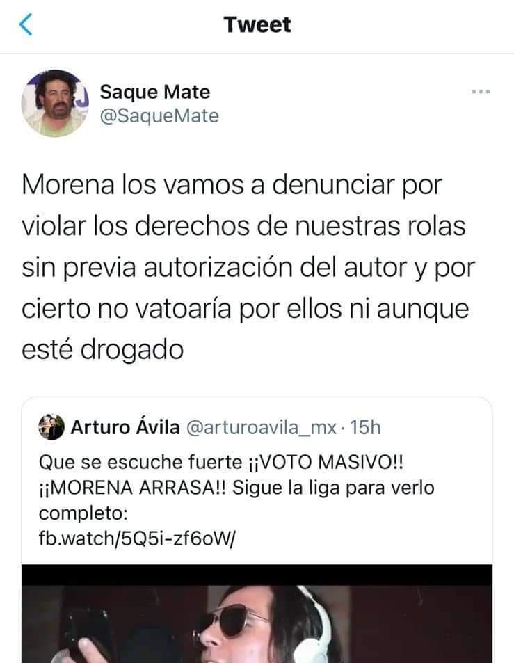 Redacción / La Voz de Michoacán Morelia, Michoacán. Luego de que el candidato de Morena a la Presidencia Municipal de Aguascalientes, Arturo Ávila Anaya, publicara en sus redes sociales un video donde, al ritmo de la canción “Voto Latino”, de Molotov, invitaba a los ciudadanos a realizar un “voto masivo” a favor del partido, la agrupación mexicana respondió a lo que ellos califican como plagio. A través de Twitter, la banda integrada por Micky Huidobro, Tito Fuentes, Randy Ebright y Paco Ayala, respondió a un mensaje del candidato de Morena en el que especifica que el tema de la agrupación fue una inspiración para su spot y que no es un político, sino un ciudadano dispuesto a cambiar su ciudad. "A nuestros amigos de @MolotovBanda: Gracias por ser inspiración del proyecto. El talento artístico es local, gracias por darles el empujón. Claramente se cambiaron las partituras y la letra. No soy político, soy un ciudadano que quiere transformar la ciudad", se lee. https://twitter.com/arturoavila_mx/status/1399438134602080260 Molotov replicó dicho mensaje y se lanzó en contra Arturo Ávila: "Aguas Aguascalientes con este ciudadano que se quiere convertir en político para transformar el significado de robo y plagio en inspiración! ¿Ó en el México que quieres todos pueden robar? #sonexcusas y no somos amigos, cuates los huevos y no se hablan!". “¡Voto masivo, Morena arrasa! ¡Voto Masivo y sin excusas!”, se escucha en el coro del cover donde el candidato, acompañado de varios jóvenes, canta y señala que él es el único que puede traer un cambio en Aguascalientes. https://twitter.com/MolotovBanda/status/1399713343263367168 El spot del candidato ocasionó algunas críticas también entre los cibernautas por el cambio a la letra de la canción original. En un primer momento, Molotov mostró su molestia y compartió la versión original de su tema lanzado en 1997. https://twitter.com/MolotovBanda/status/1399427820540108802 Molotov y la política Los integrantes de la banda han expresado su opinión sobre la política mexicana tanto en sus canciones como fuera de ellas. Por ejemplo, en 2019. Paco Ayala, cantante y guitarrista de la banda, dijo a El Universal con respecto al gobierno en ese momento: “No veo que esto avance, creo que un punto fundamental de este nuevo gobierno era hacer sentir más segura a la ciudadanía con mejor calidad de vida pero aún en el país entero lo seguimos esperando”. Años antes y bajo otro gobierno, en junio de 2012 y en el marco del estreno de su documental "Gimme the power", Tito Fuentes compartió que las letras de sus canciones, como el caso de la que dio título al filme, seguían vigentes. En ese mismo mes, durante una presentación con Los Románticos de Zacatecas en el Lunario del Auditorio Nacional, enviaron un mensaje especial a los entonces candidatos a la Presidencia de México, invitando a los ciudadanos a reflexionar. https://youtu.be/LyVy1sT0Y3U "Este es un son dedicado a todos los candidatos. Échenle coco", dijo Tito antes de interpretar "Puto". Apenas en abril de este año, Paco Ayala dijo a El Universal, a pregunta expresa sobre su opinión del contexto actual de la política en el marco de las elecciones: "Como ciudadano no puedes dejar nunca de cuestionar lo que está haciendo el país, las decisiones que se están tomando, el cuestionar constantemente lo que hacen es parte de nuestra chamba porque es parte de la chamba que tendrán que hacer para que el país salga adelante. "Estamos en una situación delicada, la pandemia agudizó la frustración de no salir adelante tan rápido como se esperaba como país porque obviamente está todo frenado. La afectación a los bares, restaurantes, el entretenimiento, toda una cantidad de millones de personas afectadas es una cadena... Pero también nos toca colaborar y opinar, no solamente estarnos quejando y retomando situaciones problemáticas porque no creo que se avance mucho con eso, proponiendo y haciendo cambian las cosas". Pero en sus canciones, además de la mencionada “Ginme the power”, también hay mensajes políticos, como en “Hit me”, que empieza “cuando era niño quería ser como Superman, pero ahora ya quiero ser diputado del PAN, o del PRI o del PRD, o cualquier cosa que tenga un poco de poder”, y a eso le sigue una larga crítica hacia la clase política y la Policía. Pero también en “Da da da” hay reproches: “No me quiera chamaquear (aha) que me quieres ayudar (aha) ¿qué es lo que me vas a dar? (¿aha?) No nos vamos a dejar (aha). Sobre mí quieres pasar (aha), quieres que vaya a votar (aha) ¿Que te quieres postular? (¿aha?) Pa' poderme gobernar (aha)”. https://www.youtube.com/watch?v=k5ZW2WlTJoU