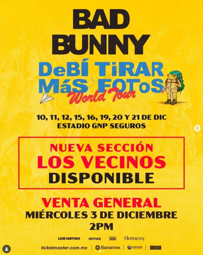Redacción / La Voz de Michoacán Este próximo miércoles 3 de diciembre se abre la venta de los boletos para el Word Tour “DeBí TiRAR MáS FOTos”, presentando una nueva sección “Los Vecinos”. La venta de boletos estará disponible al público general a partir de las 14:00 horas, para los días 10, 11, 12, 15, 16, 19, 20 y 21 de diciembre, en el Estadio GNP Seguros. Se menciona, por medio de la página promocional de Instagram, las siguientes indicaciones del boleto: Los asientos forman parte del montaje del escenario y no estarán enumerados, ya que la zona es general. Venta disponible en Ticketmaster. El boleto no incluye beneficios adicionales. El precio del boleto de Bad Bunny en Ticketmaster variará de acuerdo con la zona, desde 1,203 pesos hasta 12,183 pesos.