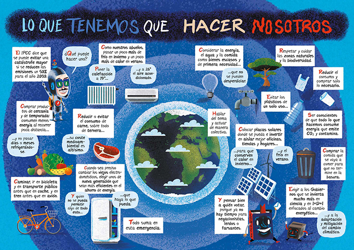 EFE / La Voz de Michoacán Madrid. Un viaje a través de "millones de años de evolución" llega hasta la "sexta extinción masiva" que está "creando el ser humano", así lo retrata el autor e ilustrador argentino Darío Adanti en su nuevo cómic "El meteorito somos nosotros", un ensayo que parte de la "ciencia" y el "humor" para indagar en el cambio climático de la mano de Astiberri Ediciones. "Quería que fuese lo más cercano a la realidad" haciendo uso de "datos reales" y de explicaciones científicas ante esta situación "muy grave y urgente" para la que "no estamos a tiempo de dar marcha atrás", pero sí de evitar que "sea peor, tan dramática o apocalíptica", destaca Adanti a EFE en una entrevista. En sus 160 páginas de ilustraciones explicativas y dramáticas que muestran "terror" en sus personajes y a través de un lenguaje simple y lleno de humor, el autor analiza la evolución del cambio climático, su papel en extinciones masivas y la transformación del planeta, sobre todo, con la implicación directa del ser humano. Imagen del interior del cómic cedida por Astiberri Ediciones. EFE De esta forma, incide en el inicio de lo que los científicos denominan "el Antropoceno" como "el siglo" donde el ser humano "ha transformado todo", viendo el desarrollo de las civilizaciones en las que "cada vez somos más, crecemos y consumimos más", siendo un planeta "finito". Además, el ensayo gráfico pone sobre la mesa en su último capítulo "lo que se está haciendo y lo que se puede hacer", tanto desde el punto de vista de la ciudadanía como de los gobiernos, para conservar el planeta. "El ser humano tiene una gran capacidad de cooperar y de solucionar cosas". Sin embargo, "siempre se están dando los peores escenarios que da el Grupo Intergubernamental de Expertos Sobre el Cambio Climático (IPCC) en sus informes" porque "no logramos reducir los gases de efecto invernadero" y sigue subiendo la temperatura. Entre los datos más alarmantes, el cómic recoge, además del impacto de las ya presentes catástrofes naturales, cómo se han reducido "todas las especies de mariposas y aves a la mitad" o "una cuarta parte de los peces y las plantas", pronosticando "a este ritmo" para el 2050 la desaparición del 25 % de "todas las especies existentes". Imagen del interior del cómic cedida por Astiberri Ediciones. EFE El mundo no aguantará las necesidades del ser humano. Por ello, Adanti afirma que hay que ser conscientes "de lo que provocamos y de lo que tenemos que hacer para que el daño sea el mínimo", advirtiendo de que si no "empezamos a ser serios, nos quedaremos sin casa". El autor, que ha dedicado siete años a documentarse para crear "El meteorito somos nosotros", prevé publicar una segunda parte que cuente con una visión "al futuro más cercano", incorporando diferentes "voces", como la de los economistas, entre otros puntos de vista. Así, el cofundador de la revista Mongolia, autor de la publicación satírica El Jueves y de cómics como "La ballena tatuada" o "El señor cabeza de tostadora", mantiene que en todos ellos el medio del cómic "une a generaciones" por su combinación de lectura e imágenes, así como el humor como esencia, "siempre muy presente en la comunicación humana".