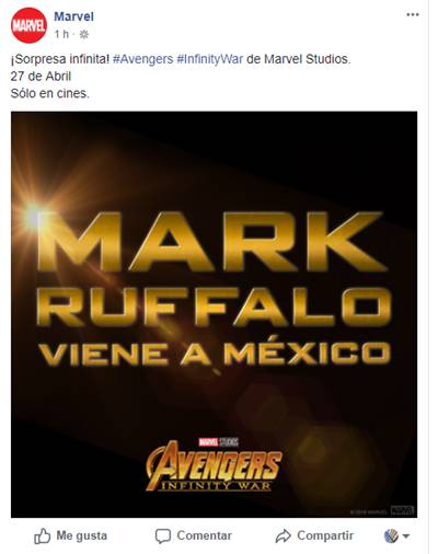 El Universal / La Voz de Michoacán Ciudad de México. El actor estadounidense Mark Ruffalo visitará México para promover la cinta "Avengers: Infinity War". Su nombre se convirtió en tendencia en Twitter luego de darse a conocer la noticia de que acompañará en su visita a México a Joe Russo, director de la película. En la cuenta oficial de Facebook de Marvel se dio a conocer la noticia, pero sin dar la fecha exacta de la venida de Ruffalo a México. "Avengers: Infinity War" se estrena en México el día 26 y el 27 de abril, a nivel mundial. Scarlett Johansson, Josh Brolin, Chris Evans, Chris Hemsworth y Robert Downey Jr. También forman parte del elenco de la cinta sobre superhéroes. https://www.facebook.com/MarvelLatinoamerica/videos/1917849754944984/
