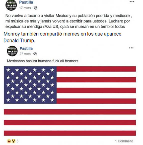El Universal / La Voz de Michoacán Ciudad de México. Víctor Monrroy, vocalista del grupo Pastilla, publicó en las redes sociales de la banda, comentarios racistas contra los mexicanos. "No vuelvo a tocar o a visitar México y su población podrida y mediocre, mi música es mía y jamás volveré a escribir para ustedes. Lucharé por expulsar su mendiga raza US, ojalá se mueran en un temblor todos", fue uno de los mensajes. Aunque los mensajes fueron eliminados casi de inmediato, sus seguidores dieron hicieron capturas de pantalla a sus publicaciones, que fueron muy criticadas. Pastilla es una banda de indie rock formada en 1996 en la Ciudad de México pero que radica en EUA.