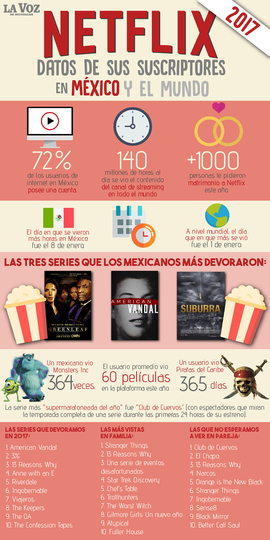 El Universal/La Voz de Michoacán Ciudad de México. Netflix informó sobre los contenidos que tuvieron más éxito en México y en el mundo; dio a conocer el balance anual del comportamiento de sus usuarios, durante este 2017. Señaló cuáles son las series que ven los usuarios en familia, las más devoradas y las que "saboreamos" (viendo menos de dos horas al día), las cuales son comedias como Disjointed, GLOW, y Santa Clarita Diet. Checa aquí otros datos de las encuestas que reveló Netflix: