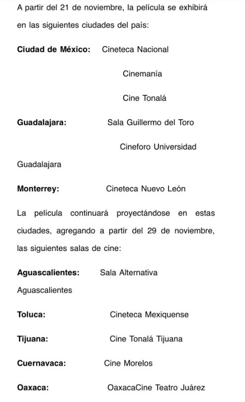Tere Jaramillo/ La Voz de Michoacán Ciudad de México. La película "Roma" será exhibida en salas de cine el próximo 21 y 29 de noviembre. Lo anterior se dio a conocer hace poco luego de que Netflix lanzará el último tráiler de la cinta de Cuarón. https://twitter.com/NetflixES/status/1062354964016754688 Roma será exhibido en ciertas salas seleccionadas en México sólo el 21 y 29 de noviembre, o al menos así hasta el momento se tiene previsto, y el 14 de diciembre estará en Netflix. Cabe destacar que la cinta ha tenido un excelente recibimiento, ha ganado el León de Oro en el Festival de Cine de Venecia y su estreno en México fue en el Festival Internacional de Cine de Morelia.