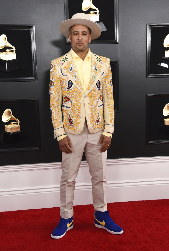 Ben Harper lució una chaqueta de lentejuelas amarillas con un amplio sombrero.
