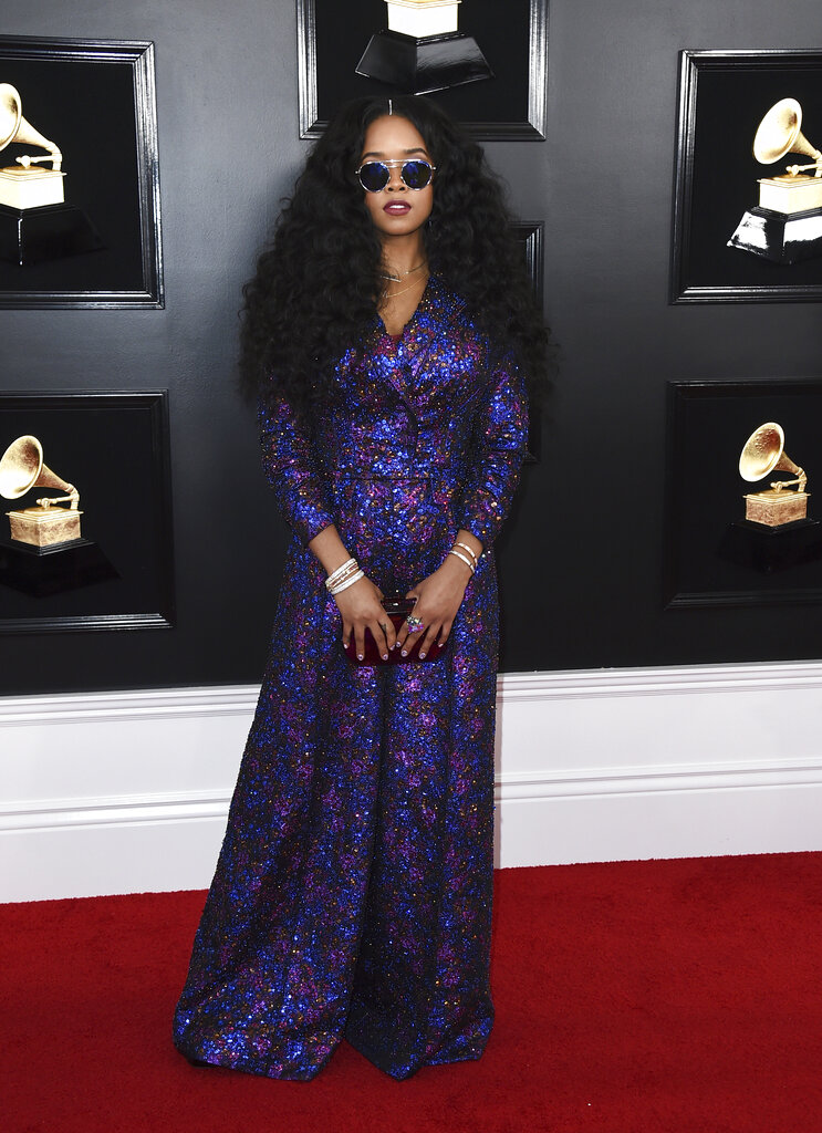 El morado fue el color de la noche. La ganadora del Grammy H.E.R. brilló en un vestido Coach de este color, con lentes de sol en el mismo tono.