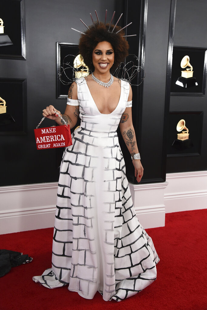 La provocadora política Joy Villa, quien el año pasado asistió en un vestido decorado con un feto, se vistió como el muro del presidente Donald Trump y llevó un bolso con el eslogan del mandatario “Make America Great Again”. Hace dos años ya había lucido mensajes de Trump en la alfombra roja.