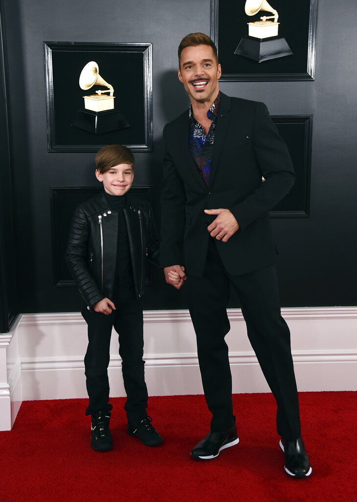 Ricky Martin, con pantalón y chaqueta negra sobre camisa estampada, llegó acompañado de uno de sus mellizos, Matteo, también ataviado de negro.