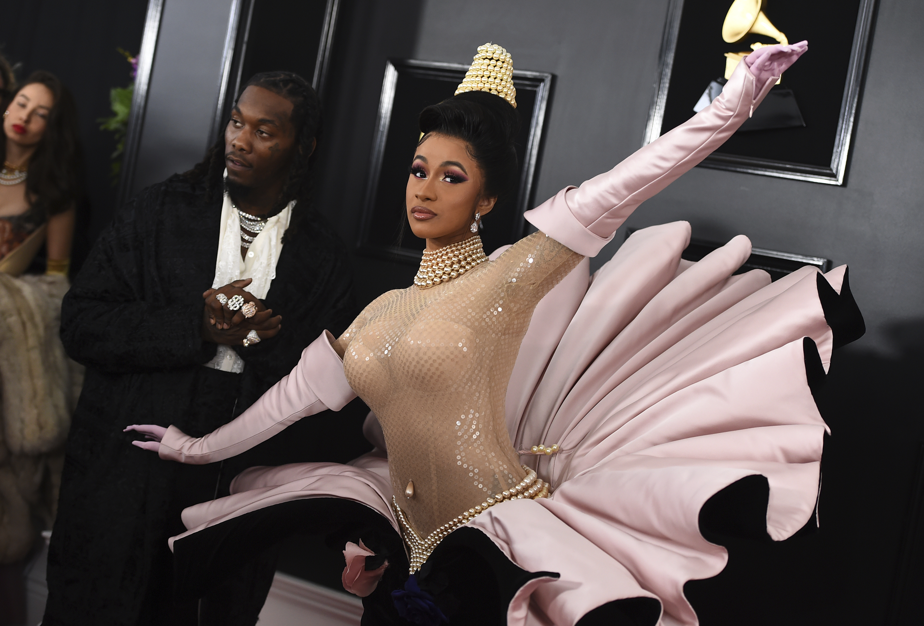Cardi B tuvo algo de dificultad para caminar en un vestido esculpido que evocaba una banana pelada, solo que rosada. Michelle Obama apareció en el escenario en un traje metálico de pantalón y Jennifer López llevó un enorme sombrero blanco enjoyado.