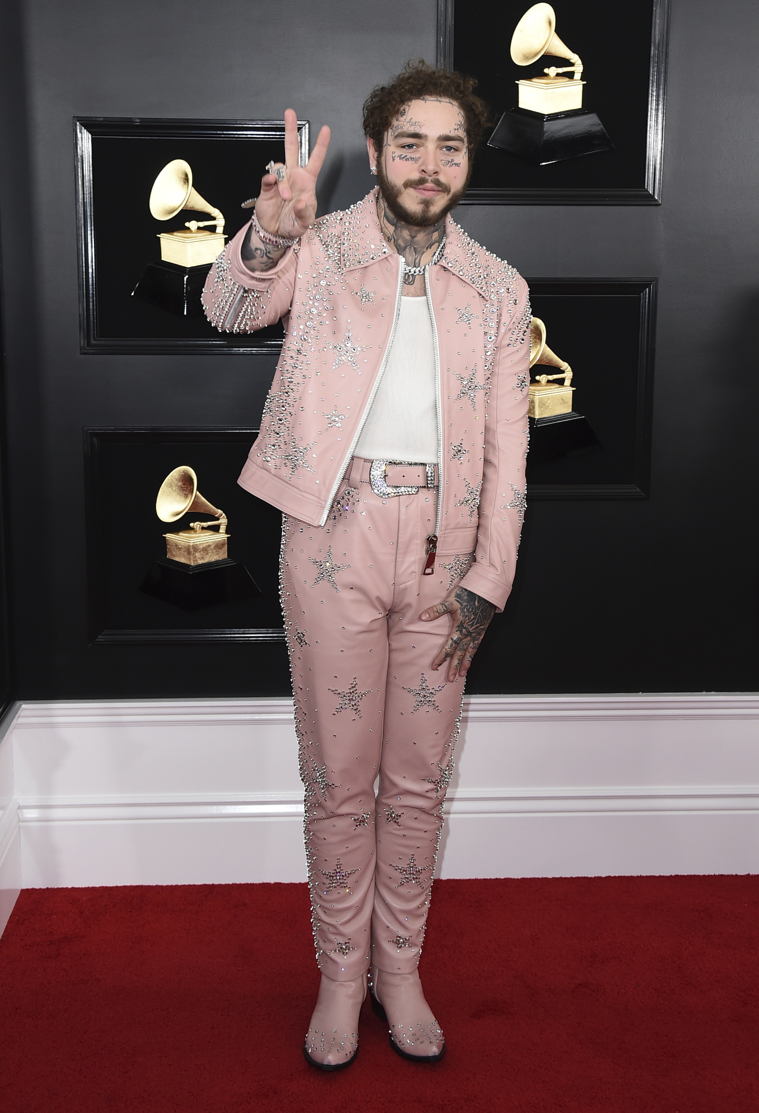 Lady Gaga optó por un vestido plateado sin tirantes y Post Malone lució una chaqueta rosa clara con adornos y pantalón a juego. Los grandes sombreros, de hecho, fueron un accesorio popular, y el de López hacía juego con su vestido del mismo color y bordado.