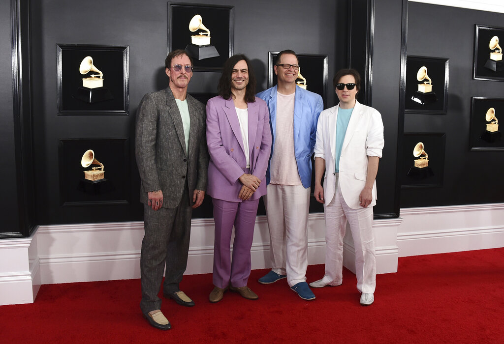 Los miembros de Weezer, por otro lado, arribaron relajados en camisetas con cuello en V bajo chaquetas en colores malva y azul claro.