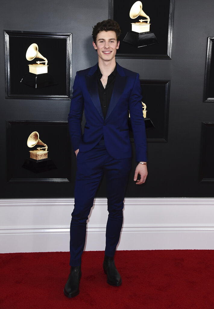 Shawn Mendes optó por una chaqueta azul oscuro de Paul Smith con grandes solapas negras sobre una camisa con cuello abierto.