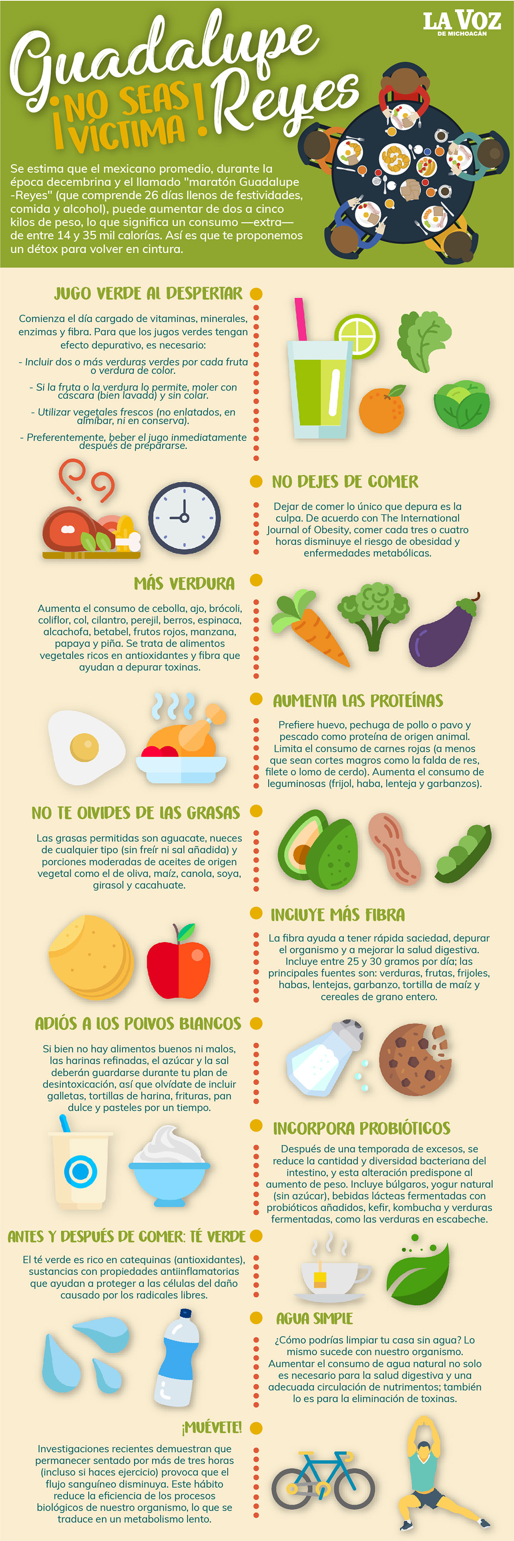El Universal/La Voz de Michoacán Ciudad de México. Se estima que el mexicano promedio, durante la época decembrina y el llamado "maratón Guadalupe-Reyes" (que comprende 26 días llenos de festividades, comida y alcohol), puede aumentar de dos a cinco kilos de peso, lo que significa un consumo extra de entre 14 y 35 mil calorías. Las funciones depurativas del organismo se obtienen de manera natural y continua, siempre y cuando se mantenga una dieta correcta acompañada de hábitos saludables. "Fácil llega, fácil se va". Perder el peso ganado durante el "Lupe-Reyes" no es tan complicado como se cree. Para reestablecer el organismo de modo saludable es necesario comenzar por dejar a un lado la culpa, depurar malos hábitos e incluir alimentos benéficos.