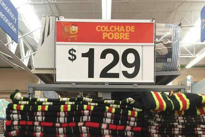 Redacción/La Voz de Michoacán Ensenada, Baja California. Mediante redes sociales se difundió una imagen que generó controversia por la presunta oferta de la cadena comercial Walmart, la venta de una "colcha de pobres". En la foto se anuncia a sólo 129 pesos en una de sus tiendas en Ensenada que ofrece cobijas presuntamente "artesanales", originarias de Coahuila, San Luis Potosí, Edomex, Oaxaca, Chiapas, etc. Luego de que la imagen fuera difundida, la empresa fue calificada como clasista por los usuarios de internet, al viralizarse la promoción. Hasta el momento de la publicación, un vocero de Walmart de México declaró que hasta que se corrobore la información que surgió en redes sociales, manifestarán una postura respecto al tema.
