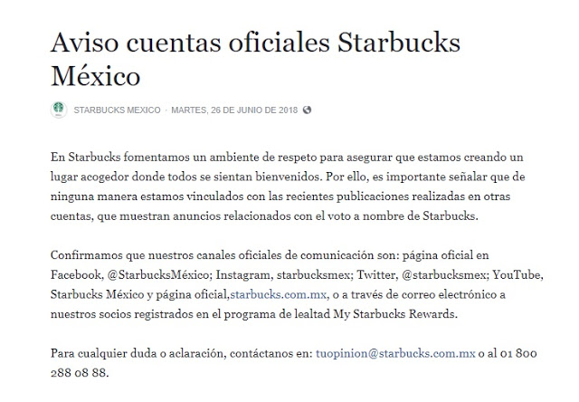 Ciudad de México. La empresa Starbucks nuvamente fue motivo de polémica y es que hace unos días circuló un mensaje en el que presuntamente ofrecía una promoción por el día de las elecciones pero menos para quienes voten por Andrés Manuel López Obrador.
