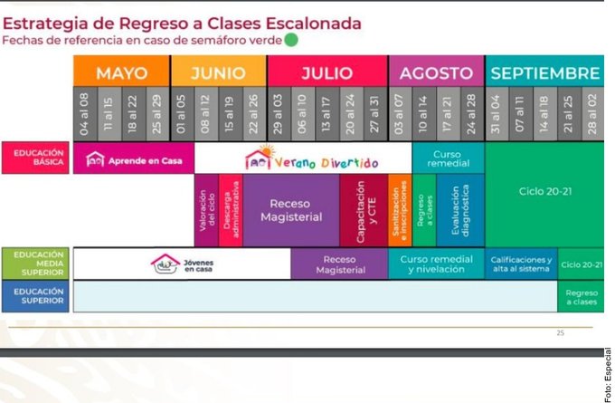 Ciudad de México. El inicio del ciclo escolar 2020-2021 en las escuelas de Educación Básica, para los casos en que el semáforo sanitario se encuentre en verde, tendrá como fecha referencial el 10 de agosto; Educación Media Superior iniciará con curso remedial de nivelación, el 3 de agosto y, en Educación Superior, no se iniciará antes del 7 de septiembre.