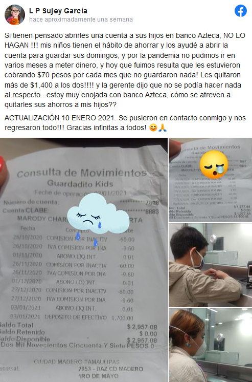 Se trata del caso publicado por la usuaria de Facebook LP Sujey García, que a principios de mes de enero publicó que la empresa había terminado con los ahorros de sus dos pequeños tras cobrar comisiones por manejo de cuenta.