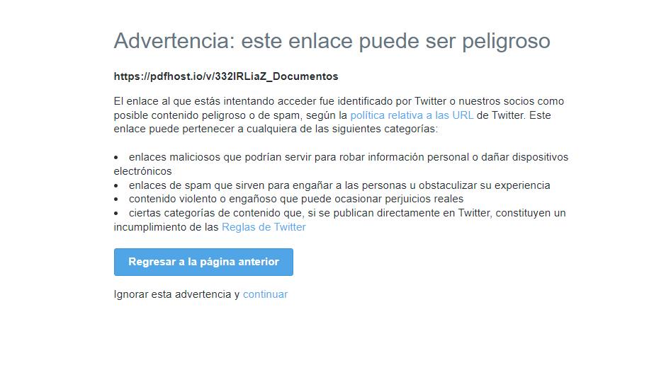 Redacción / La Voz de Michoacán Morelia, Michoacán. El presidente de México, a través de su cuenta oficial de Twitter, publicó un enlace que lleva a un documento que presuntamente comprueba los contratos millonarios que ha obtenido Xóchitl Gálvez; sin embargo, la red social lo cataloga de “peligroso”. En la publicación, López Obrador dice que es la información que recibió sobre los contratos de la senadora del PAN y aspirante a candidata presidencial, por alrededor de mil 400 millones de pesos en nueve años y que según envió a Claudio X González para su análisis y verificación. “Esta es la información que recibí sobre contratos de Xóchitl Gálvez por alrededor de 1,400 millones de pesos en nueve años y que estoy enviando al señor Claudio X. González para su análisis y verificación. Además, él puede ampliar la información, con sus investigadores, y hacer la denuncia legal correspondiente”. https://twitter.com/lopezobrador_/status/1679914704721047553?s=20 Sin embargo, al acceder al enlace no lleva directamente al documento, sino que antes hay una advertencia de Twitter de que “puede ser peligroso: El enlace al que estás intentando acceder fue identificado por Twitter o nuestros socios como posible contenido peligroso o de spam, según la política relativa a las URL de Twitter. Este enlace puede pertenecer a cualquiera de las siguientes categorías: • enlaces maliciosos que podrían servir para robar información personal o dañar dispositivos electrónicos• enlaces de spam que sirven para engañar a las personas u obstaculizar su experiencia• contenido violento o engañoso que puede ocasionar perjuicios reales• ciertas categorías de contenido que, si se publican directamente en Twitter, constituyen un incumplimiento de las Reglas de Twitter Es un PDF donde se da a conocer a detalle las transacciones por servicios prestados por los negocios de Xóchitl Gálvez con compañías privadas e instituciones. También contiene los datos fiscales de las compañías de la senadora, así como los representantes legales y socios. Antes del tuit del mandatario nacional, Gálvez Ruiz lo retó a que demostrara su afirmación, y si es cierta, renuncia a su aspiración de encabezar el proyecto del Frente Amplio por México; si no, que renuncie él a la presidencia “por mentiroso”, dijo.