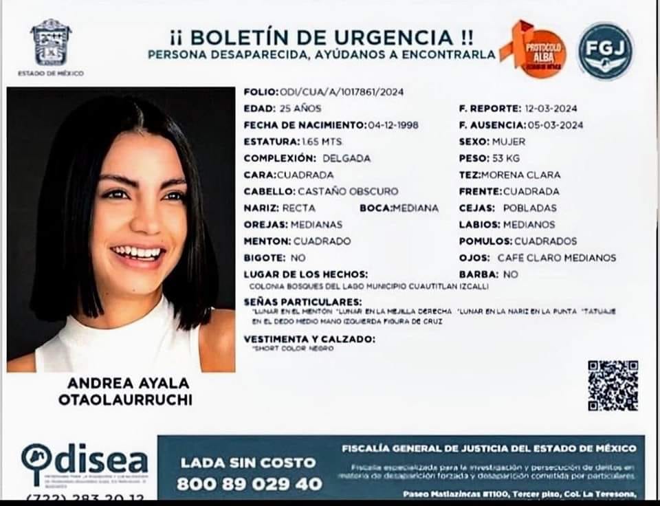 Redacción / La Voz de Michoacán Morelia, Michoacán. - La Fiscalía del Estado de México inició oficialmente la búsqueda de Andrea Otaolaurruchi, ex participante de Acapulco Shore, quien fue reportada como desaparecida hace 22 días, ya que fue vista por última vez el 5 de marzo de 2024 y su desaparición fue reportada siete días después. La información sobre la desaparición de Otaolaurruchi se viralizó en redes sociales cuando el influencer Gabriel Montiel, conocido como Werevertumorro, compartió un cartel solicitando ayuda para encontrarla. Aunque la publicación fue eliminada minutos después, el periodista Gerardo Escareño la rescató y la compartió, generando una mayor difusión del caso. La ficha de búsqueda emitida por la Fiscalía detalla que Otaolaurruchi fue vista por última vez en la colonia Bosques del Lago, en Cuautitlán-Izcalli, desapareció presuntamente tras una discusión con su pareja. Andrea Otaolaurruchi, de 25 años, es reconocida por su participación en Acapulco Shore y su carrera como modelo. Estudió la carrera de piloto aviador y ha destacado en el mundo del modelaje desde los 9 años. Familiares, amigos y seguidores expresaron su preocupación en redes sociales, solicitando ayuda para encontrarla y compartir información sobre su desaparición. La ex participante de reallity show es una joven de 25 años, mide 1.65 metros, es delgada, con cabello castaño oscuro y ojos café claros. Presenta lunares en la nariz y mejilla derecha, y un tatuaje en la mano izquierda. Sin embargo, hasta el momento, las autoridades poseen indicios sobre su paradero ni han especificado las circunstancias de su desaparición.