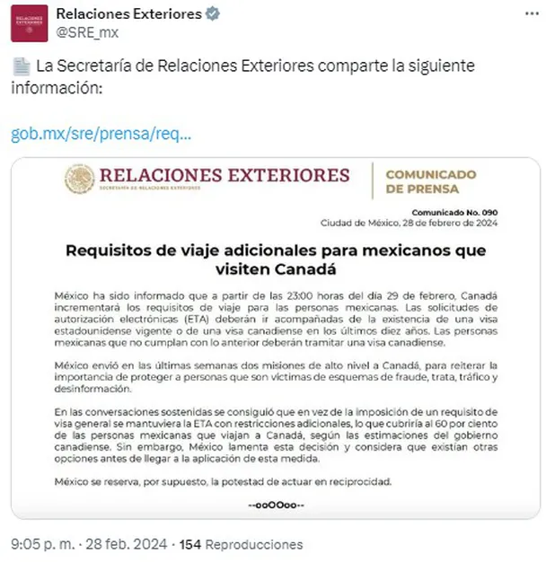 Redacción / La Voz de Michoacán Canadá endureció sus políticas de ingreso al país y, a partir de las 11:00 de la noche de mañana jueves 29 de febrero, además de las solicitudes de autorización electrónica (ETA) que pide para entrar a su territorio, se deberá contar con una visa estadounidense vigente o una visa canadiense en los últimos diez años, dio a conocer la Cancillería de México. El gobierno de México lamentó que Canadá reimponga algunos requisitos de visado a los ciudadanos mexicanos que deseen entrar a ese país, medida tomada en respuesta al aumento en la afluencia de refugiados. En 2023, la Junta de Inmigración y Refugiados de Canadá registró 17 mil 490 solicitudes de México, cuando un año antes, la cifra fue de 7 mil 483. La Secretaría de Relaciones Exteriores detalló que en las últimas semanas envió dos misiones de alto nivel a Canadá, en cuyas visitas se logró que el país del norte mantuviera solo el requerimiento de la ETA con ciertas restricciones, lo que afectaría al 10 por ciento de los mexicanos que viajan a ese país. “México lamenta esta decisión y considera que existían otras opciones antes de llegar a la aplicación de esta medida. México se reserva, por supuesto, la potestad de actuar en reciprocidad”, dijo la cancillería en un comunicado que compartió en sus redes sociales, pero que eliminó minutos después.
