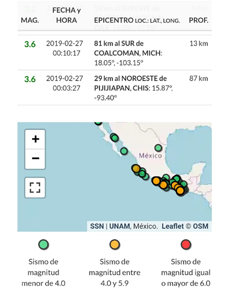 Redacción / La Voz de Michoacán Ciudad de México. El servicio sismológico nacional reporta un total de 63 movimientos telúricos en las últimas 30 horas, principalmente en los estados de la costa del Pacífico. En Michoacán solo se ha registrado 1 con epicentro en Coalcomán mientras que el resto se han generado en Oaxaca y Guerrero y hasta los estados de baja California. Especialistas ya revisan la relación de estos eventos sísmicos. En su reporte de sismicidad, el organismo del Instituto de Geofísica de la UNAM dio a conocer que el movimiento de tierra de mayor magnitud, de 4.1, ocurrió a las 02:38 horas de este jueves a 158 kilómetros al suroeste de Mapastepec, en el estado de Chiapas. “SISMO Magnitud 4.1 Loc 158 km al SUROESTE de MAPASTEPEC, CHIS 28/02/19 02:38:46 Lat 14.36 Lon -93.85 Pf 10 km”, precisó en su cuenta @SSNMexico de Twitter. El organismo de la Universidad Nacional Autónoma de México (UNAM) dio a conocer que en Oaxaca se registraron 44 sismos, en Guerrero ocurrieron cinco, en Chiapas seis, en Colima tres, en Jalisco dos, en Baja California dos y uno en Veracruz.