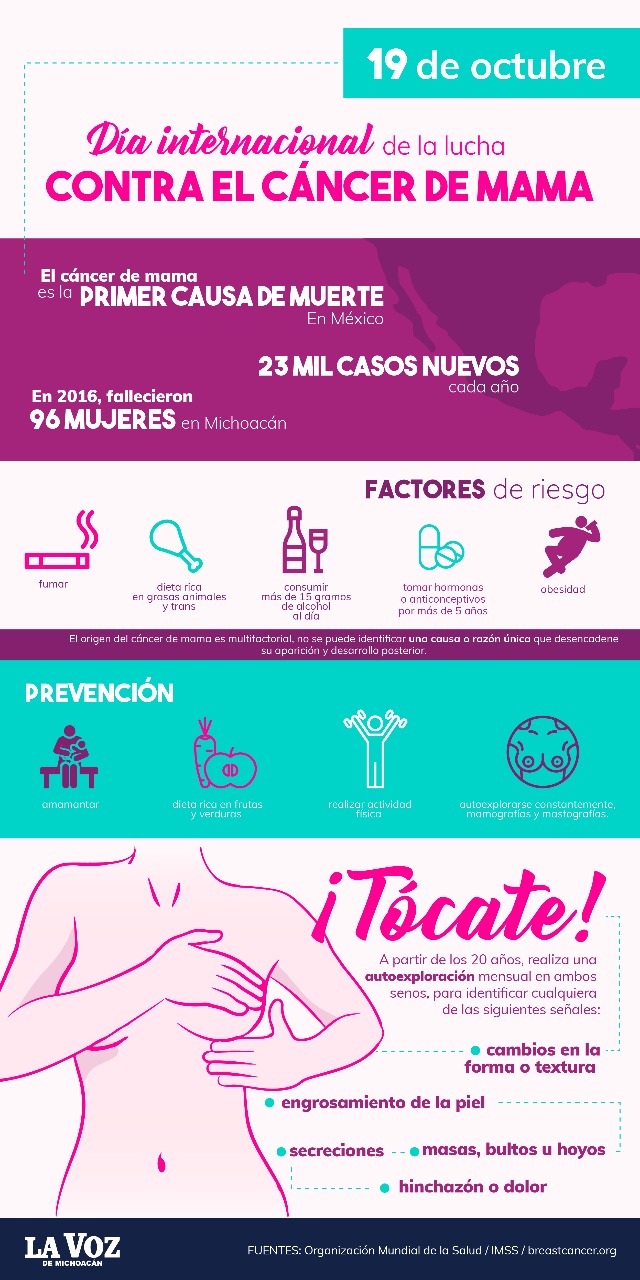 Notimex/La Voz de Michoacán Puebla, Puebla. Desde el 2006, el cáncer de mama ocupa el primer lugar en muertes de mujeres por tumoración maligna, desplazando de esa posición al cáncer cervicouterino, afirmó el especialista José de Jesús González Izquierdo. El cáncer de mama es el más frecuente entre las mujeres, pues representa el 16 por ciento de los cánceres femeninos, señaló el especialista Alejandro Chías. En lo que respecta a México, cada año se reportan seis mil muertes por cáncer de mama en el país y se presentan alrededor de 23 mil nuevos casos, es decir 60 nuevos casos al día. Además, cerca del 70 por ciento de estos casos se presenta en mujeres de entre 30 y 59 años de edad, apuntó. El subdirector médico de una firma de seguros, comentó que octubre ha sido declarado por la Organización Mundial de la Salud (OMS), el mes de Sensibilización sobre el Cáncer de Mama, como una medida para que la población tome conciencia de la gravedad de este padecimiento. Agregó que de acuerdo a cifras internacionales, cada año se registra 1.38 millones de casos nuevos a nivel mundial, de los cuales 458 mil tienen un desenlace fatal. Algunos tratamientos combinan diferentes modalidades terapéuticas, entre quimioterapia, hormonoterapia, mastectomía, radioterapia y cirugía, dijo. Entre las medidas de detección oportuna se encuentran la autoexploración a partir de los 25 años de edad, en caso de factores hereditarios se debe hacer antes de esa edad, realizarla cada mes, practicar una mastografía y/o ultrasonido de mama, señaló. También, aunque el cáncer de mama no es prevenible, si se puede contribuir a reducir el riesgo llevando un estilo de vida saludable como consumir productos naturales y bajos en grasa, hacer ejercicio cada día, dormir de siete a ocho horas diarias y eliminar o evita el consumo de alcohol y tabaco, apuntó.