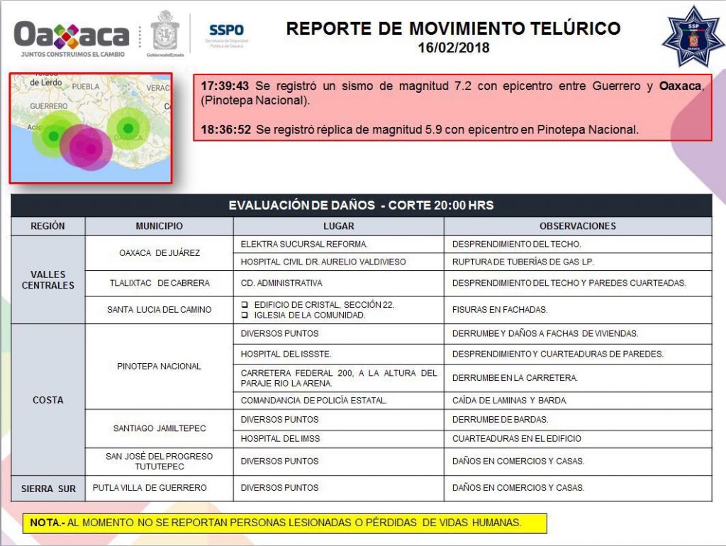 El Universal/ La Voz de Michoacán Ciudad de México. El director General de la Comisión Federal de Electricidad (CFE), Jaime Hernández, informó que cerca de 998 mil hogares y comercios de cinco entidades se encuentran sin suministro de energía eléctrica por el sismo de 7.2 grados de la tarde de este viernes. Sin embargo, alrededor de las 21:00 horas reportó que en alrededor del 54% de los hogares ya había restablecido el servicio electrónico. En entrevista con ForoTv, Hernández indicó que en la Ciudad de México hay afectaciones en la electricidad de 531 mil hogares, principalmente en las delegaciones Tlalpan, Xochimilco, Tláhuac, Azcapotzalco y Benito Juárez. En el Estado de México 200 mil viviendas y comercios no tienen luz, especialmente en el municipio de Ecatepec. Además, en Guerrero hay 154 mil inmuebles afectados, en Oaxaca 110 mil y 6 mil en Morelos. El titular de la CFE precisó que no hay daños estructurales, sino problemas en postes y cableado, por lo que prevé que esta noche quede restablecido el servicio. Checa aquí, los videos del sismo registrado. Aquí te compartimos el reporte que dan las instancias oficiales, tras las revisiones de las afectaciones: Servicio Sismológico Nacional SISMO Magnitud 7.2 Loc 11 km al SUR de PINOTEPA NACIONAL, OAX 16/02/18 17:39:38 Lat 16.25 Lon -98.03 Pf 12 km. Comunicación Social Oaxaca Afectaciones en viviendas en los municipios de Pinotepa Nacional, Progreso y Tototepec. UMPC Pinotepa Nacional, Oaxaca No reporta derrumbes de viviendas, sólo fractura de viviendas. UEPC Chiapas Reporta que fue percibido de manera moderada y con activación de protocolos de evacuación. UEPC Estado de México, Michoacán y Puebla Activación de protocolos y revisión de inmuebles. UMPC Pinotepa Nacional, Oaxaca Reporta afectaciones sin cuantificar, en proceso de evaluación. Percibido fuertemente. UEPC Guerrero El Centro Estatal de Alertamiento informa que el sismo fue percibido fuerte en los municipios de la región Costa Chica, Norte, Montaña, Centro, Acapulco, de moderado a fuerte en las regiones Costa Grande y Tierra Caliente. AL momento sin reporte de daños. SPC Ciudad de México Percibido de moderado a fuerte, evacuaciones preventivas, activación de protocolos y revisión de inmuebles. UEPC Puebla Informan todos los Delegados Regionales que no hay reporte de daños. Se mantienen en monitoreo. UEPC Tabasco Al momento, sin reporte de afectaciones. SSN Informan que hasta el momento se han presentado 20 réplicas después del sismo que se registró a las 17:39 horas. MetroCDMX Después de sismo todas las estaciones y Líneas de la Red se encuentran ofreciendo servicio y operando con normalidad. La marcha de trenes es continúa. AICM Operaciones de manera normal. CFE Al momento se encuentran revisando la infraestructura eléctrica del país. SCT La Infraestructura se reporta sin afectaciones.