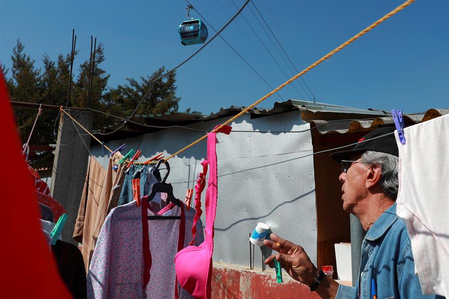 Las cabinas del teleférico, completamente acristaladas, contrastan con el paisaje de Cuautepec, un barrio que recuerda a una favela brasileña por los colores llamativos de unas casas que resiguen el contorno del cerro cayendo como si fueran una cascada.