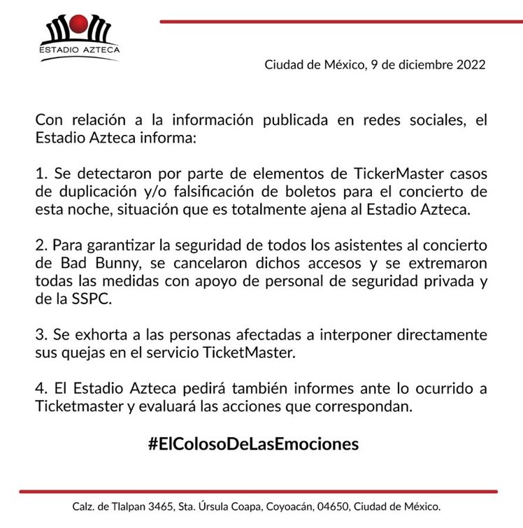 Jóvenes que se quedaron sin poder entrar al concierto convocaron a usar el hashtag #FraudeTicketmaster para visualizar la situación, pues culpan a la empresa de haber revendido sus boletos. Adriana Castillo, una de las afectadas, compartió a Milenio que pagó 36 mil pesos por 6 boletos para ver a Bad Bunny y no recibieron solución ante el problema.