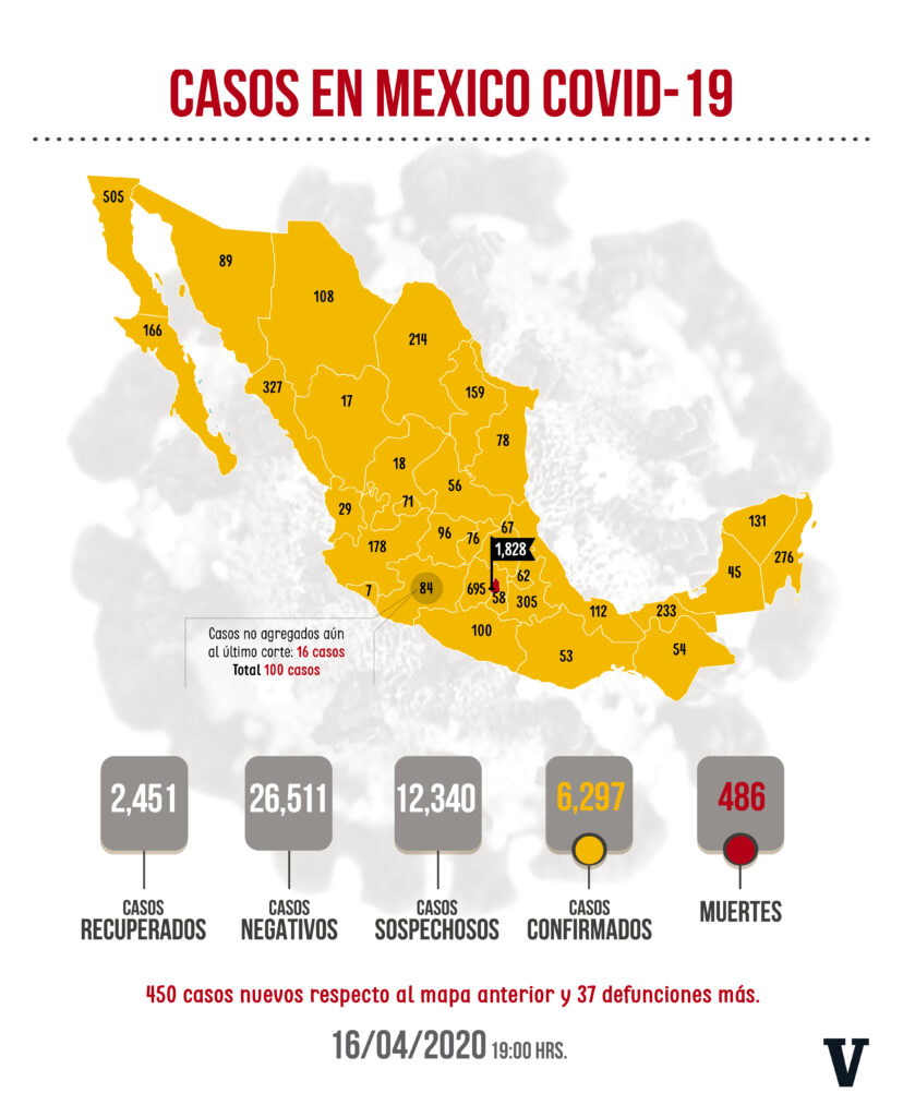 Aumentan a 486 muertes y 6,297 casos confirmados de COVID-19 en México