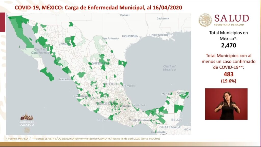 Del total de municipios que tiene México (2 mil 470), 19.6 por ciento tienen al menos un caso confirmado de COVID-19. Estos datos se monitorearán para la decisión del levantamiento de la cuarentena en las dos fechas tentativas: 17 y 30 de mayo.