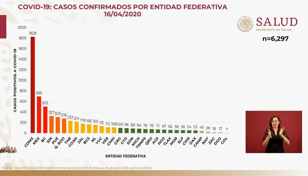 Los estados con más casos son la Ciudad de México (1,828), el Estado de México (695), Baja California (505), Sinaloa (327), Puebla (305) y Quintana Roo (276).